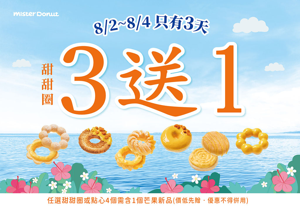 ▼從外皮到內餡,清爽香甜,要帶給消費者全新的甜蜜體驗!首三日更推出新品嘗鮮「芒芒3送1」活動,8/2(五)~8/4(日)任選四個甜甜圈,需含一款芒果新品,其中一個由Mister Donut招待(價低優先贈,優惠不得併用)!