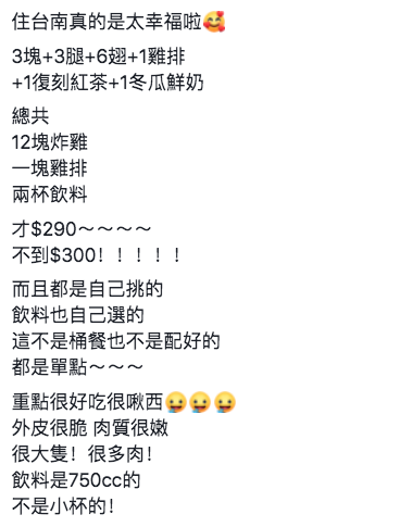 台南買「13塊炸雞+2杯飲料」只要290元 妹子點法曝光:太幸福啦
