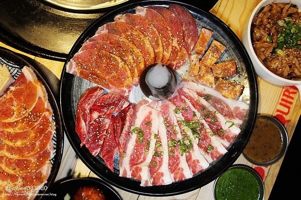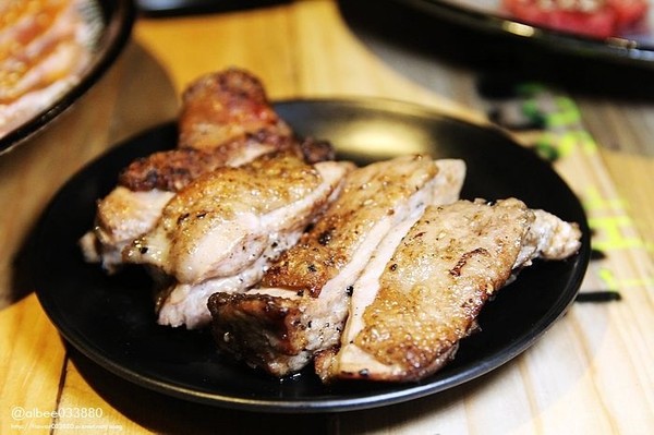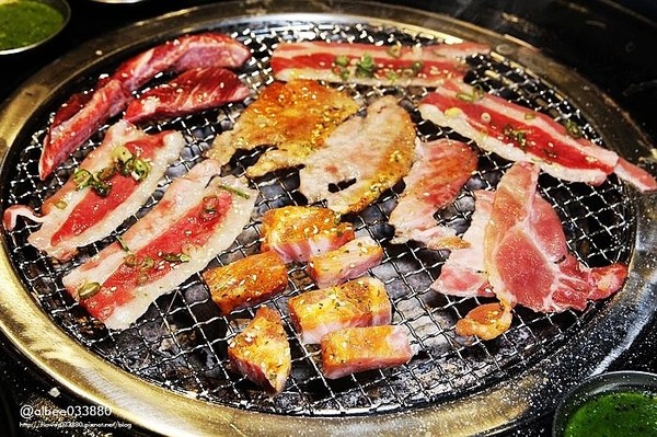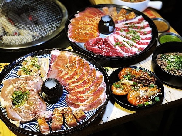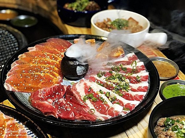 ▼「二牛二豬拼盤」裡面有牛五花、牛肋條、梅花豬、豬里肌,油花多的牛五花口感彈軟,牛肋條有嚼勁,只要烤5-7分熟就好了,!梅花豬有醃製過,微微的甜味很下飯。豬里肌烤至焦黃色之後,吃起來很有彈性不會澀~