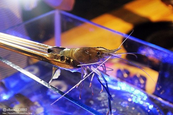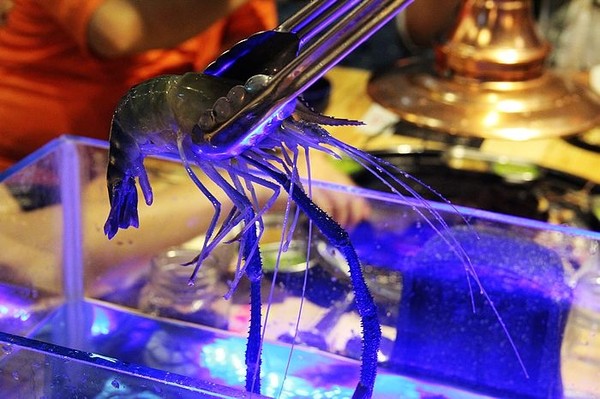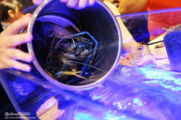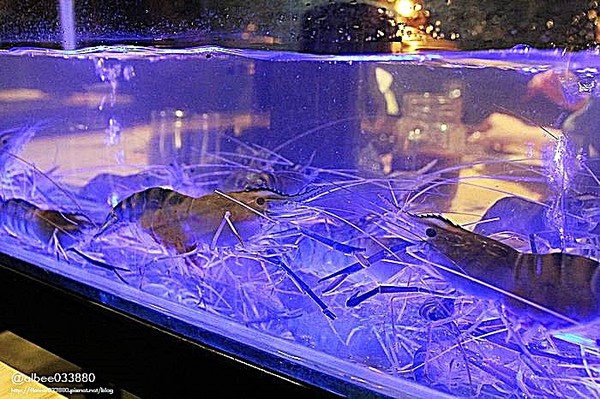 ▼而店內最受矚目的莫過於這條「泰國蝦水道」,藍色燈光的水道中有滿滿的泰國蝦,讓人忍不住就想立刻夾起來大啖鮮蝦啊!