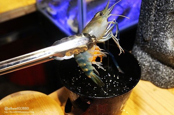 ▼每個座位上都會附上夾子以及冰水桶,想吃泰國蝦只要用夾子夾起來之後,放入冰水桶中,蓋上蓋子放置大約2、3分鐘,就可以下去火烤囉!