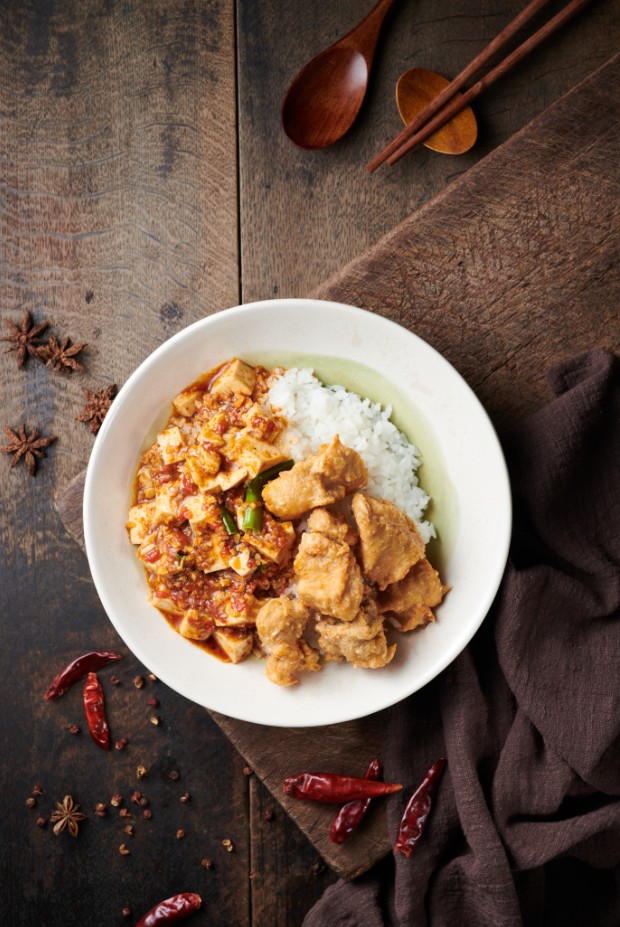 ▼繼光香香雞新推的「麻婆香雞飯」,使用芬芳醇香的四川大紅袍花椒,並以嚴選辛香料特調出麻辣醬汁,煮滾後一匙澆在剛出爐的白飯上,吸飽湯汁的鮮嫩豆腐超下飯,椒香四溢、酥麻帶勁;搭配外酥裡嫩的多汁香香雞,肉香、麻香在嘴裡融為一體,讓人欲罷不能。