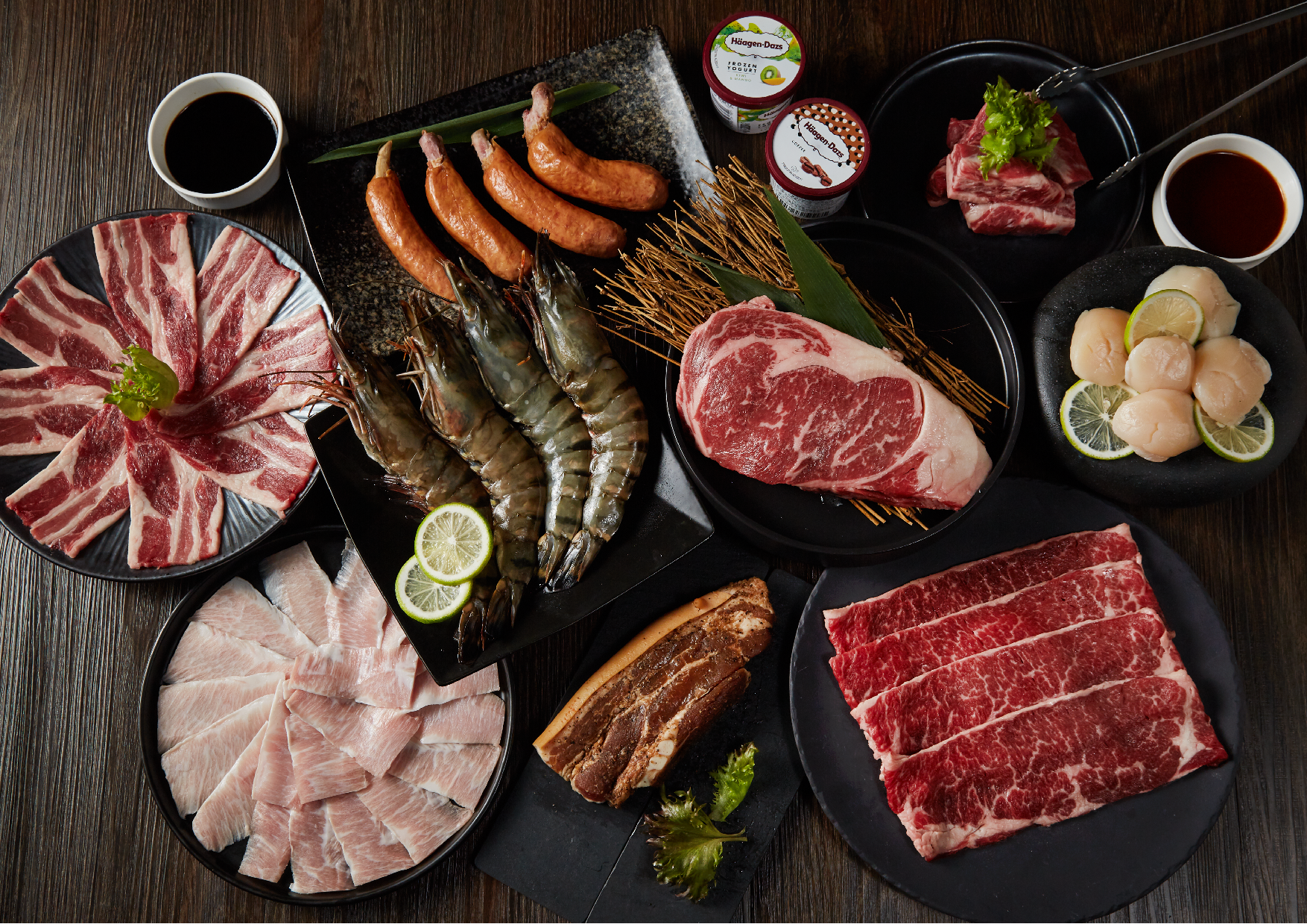 ▼「全聯豪華獨賣」(1980 or 2980元/組):包含藍絲帶雪花、霜降嫩肩、帶骨牛小排、7oz特選級肋眼、加拿大精選牛肋條、特大北海道干貝與遠洋海大蝦外,還有義大利小農豬頸肉、主廚特條鹹豬肉、與帶骨德式香腸等,非常澎湃;隨商品更附上原燒獨家水果醬與味噌醬,甚至連餐後甜食「哈根達斯」冰淇淋都準備好了,還加贈200元原燒抵用券,物超所值!