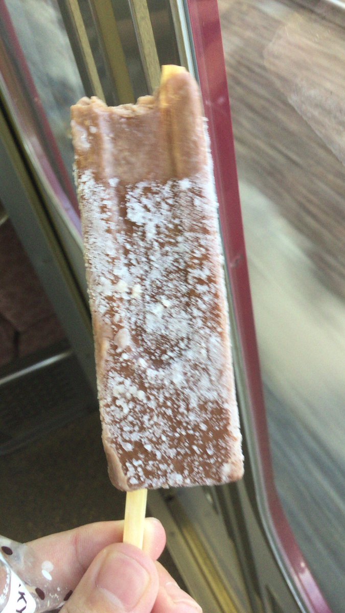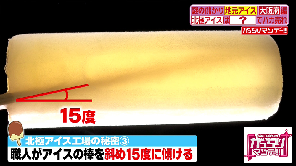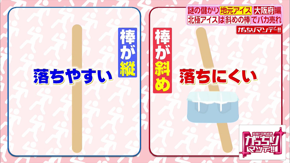 ▼於是日本節目《完全週一!》(ガッチリマンデー!!)展開了調查,才發現原來這樣歪歪的冰棒棍是店家的貼心設計:假如用直的棍子,冰棒融化後就容易滑下來;而歪歪地插進去,冰棒則不容易滑落。