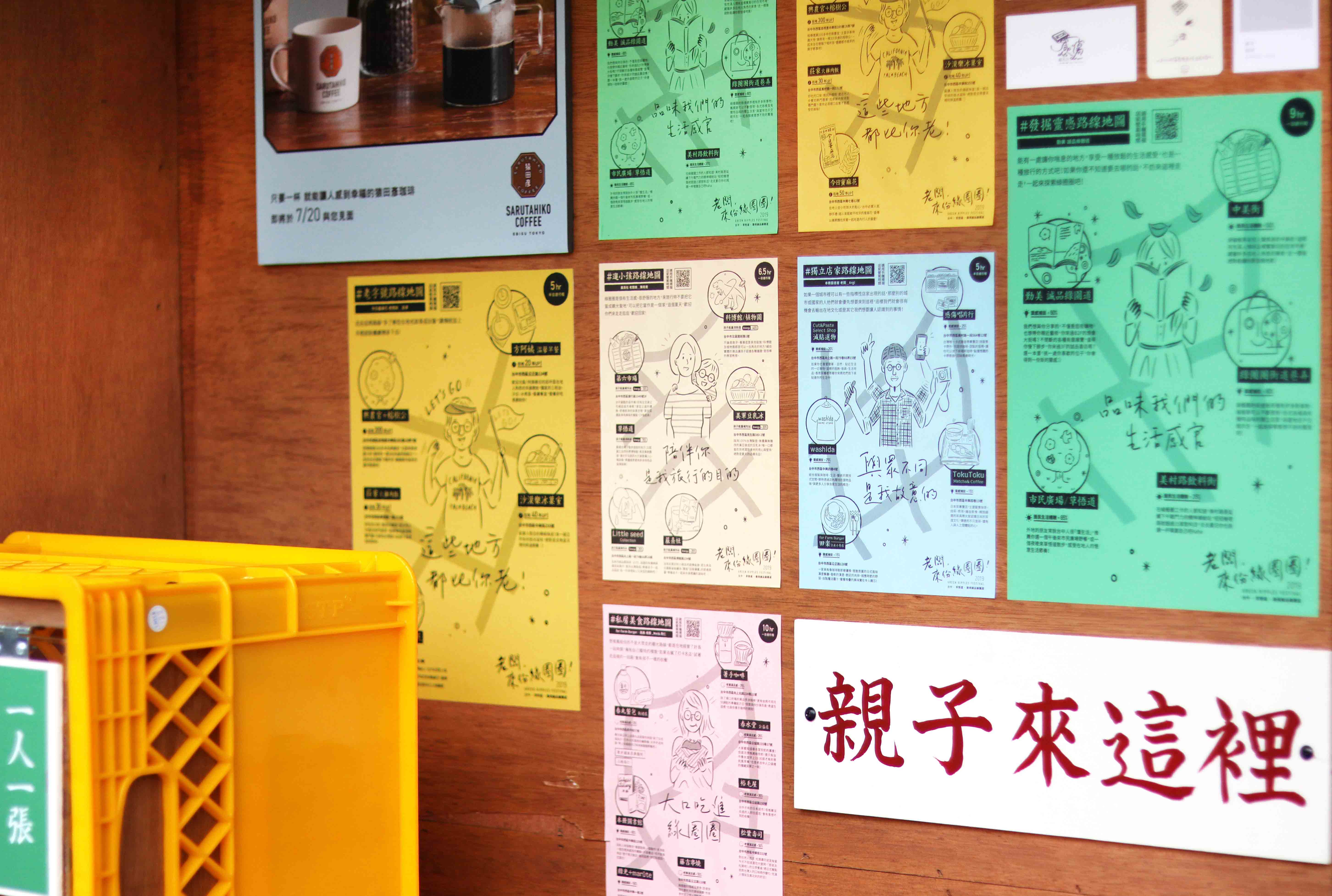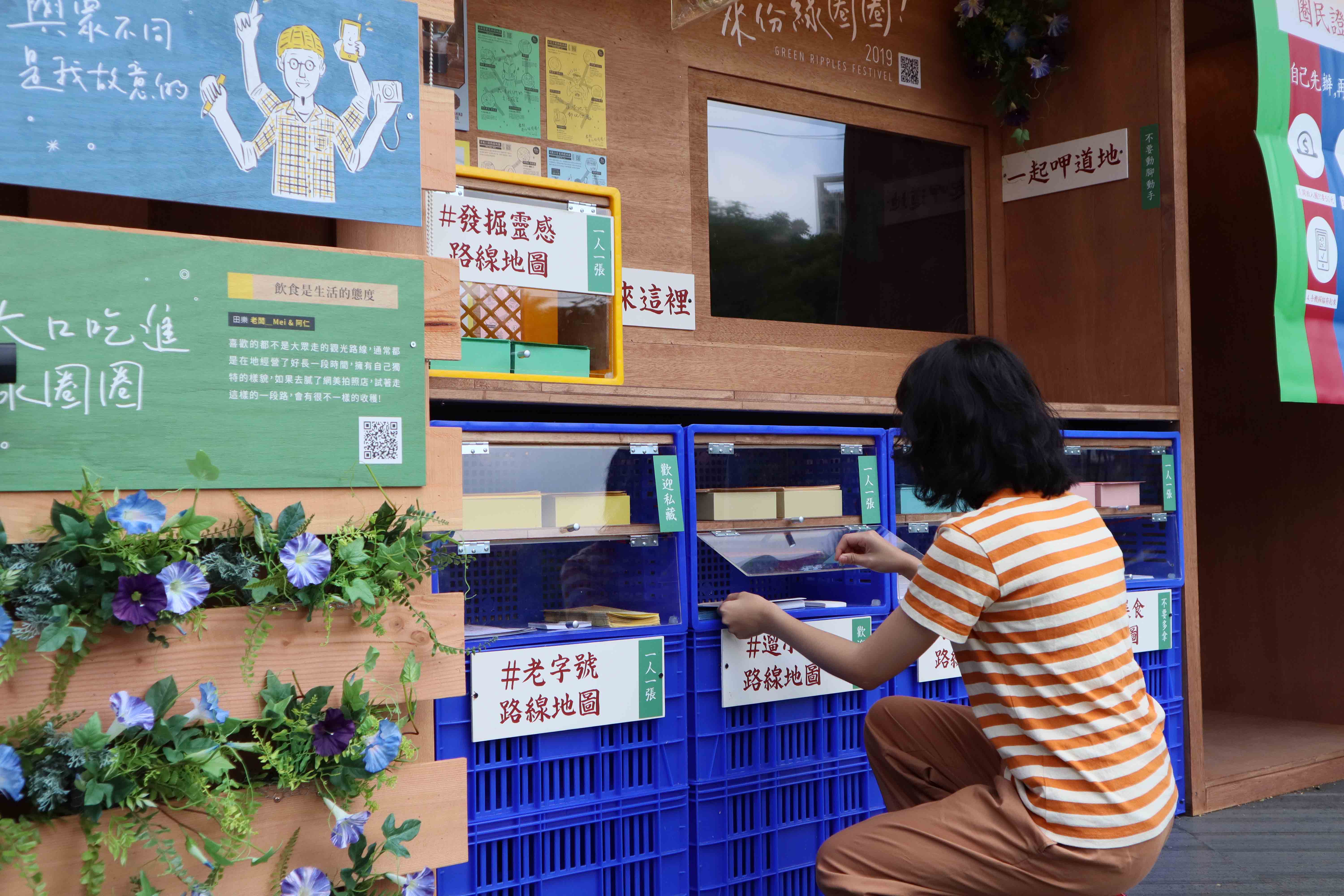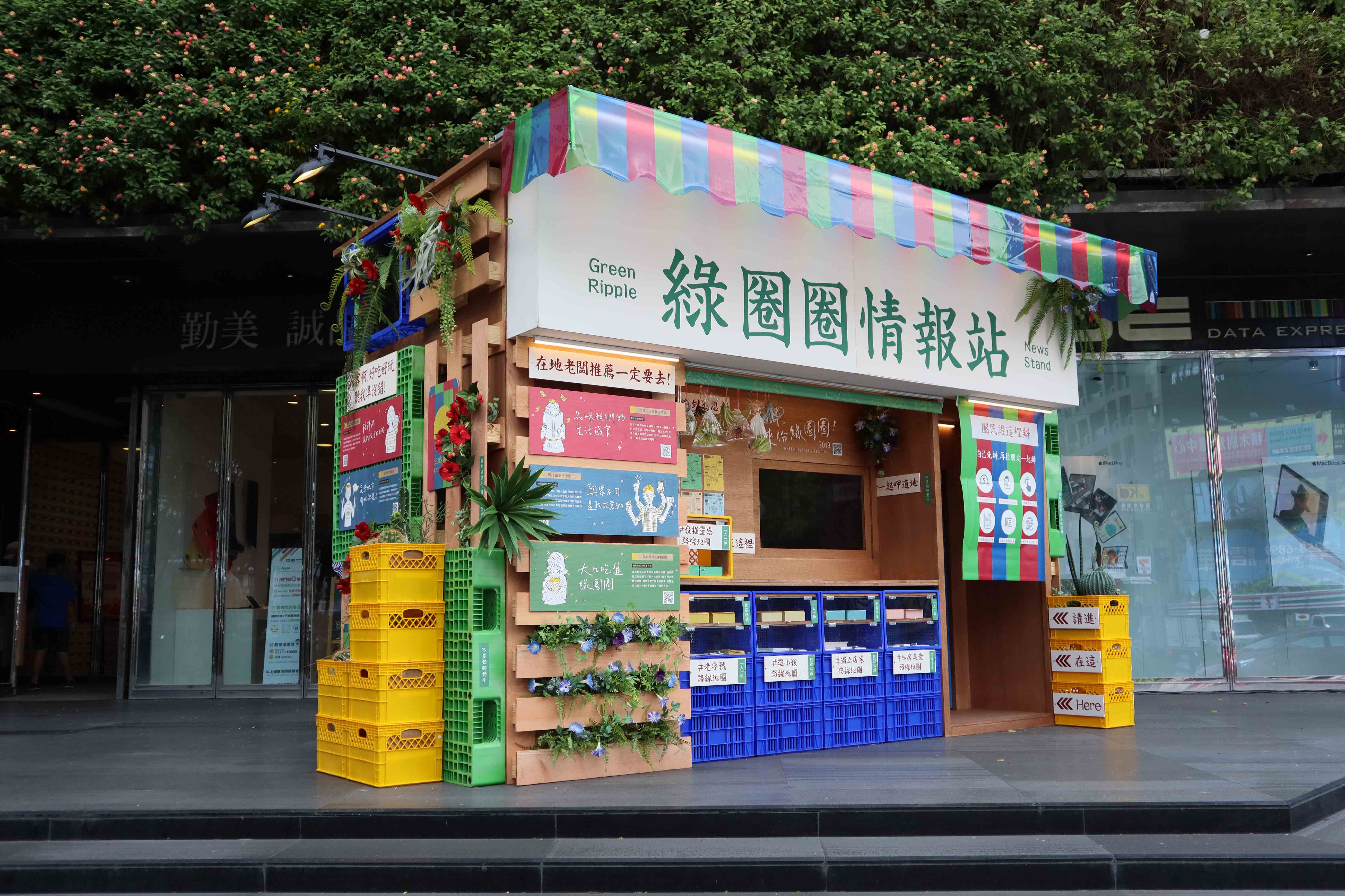 ▼本次亮點裝置「綠圈圈情報站」,以國外常見的NEWS STAND作為基底樣貌,結合台灣庶民元素的茄芷袋配色、貨籃以及手寫招牌字,搭配台灣原生植物以及木作,將在地文化融入設計,打造具生活感、人情味的情報站。