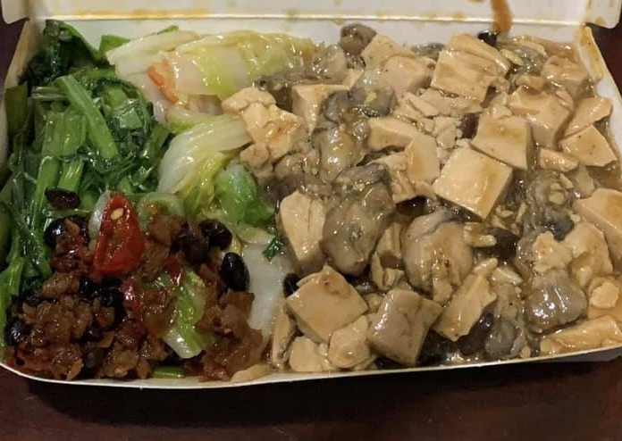 ▼2樣青菜、辣椒脯和滿滿的豆腐鮮蚵,這樣的便當在台北根本是「天價」!沒想到台中居然賣佛心價?!而且還是佛到讓人傻眼貓咪的50元!