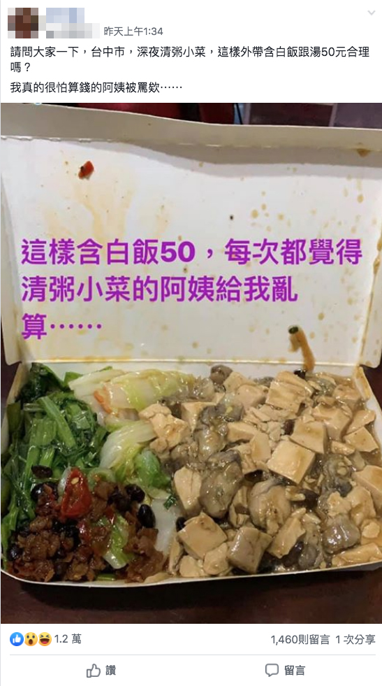 台中的朋友,你們也有吃過如此不合理的便當嗎?就算沒蚵賣50元也覺得很佛心啊!想不通的網友甚至搞笑覺得案情不單純,「你有偷拉阿姨的手吧」、「80我都買單!」、「我會付100,說不要找」、「阿姨真的亂算」!下次去台中也試試看拿同樣份量的清粥小菜吧!
