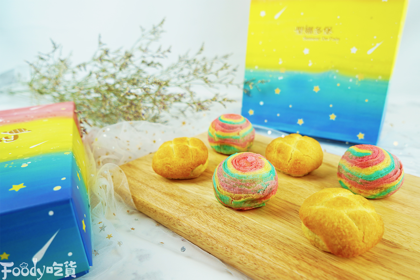 ▼「聖娜多堡彩虹菠菠星空禮盒」售價360元,造型夢幻吸睛,網美最愛,夢幻的彩虹芋頭酥加上可愛的菠蘿蛋黃酥,不僅好看更好吃!