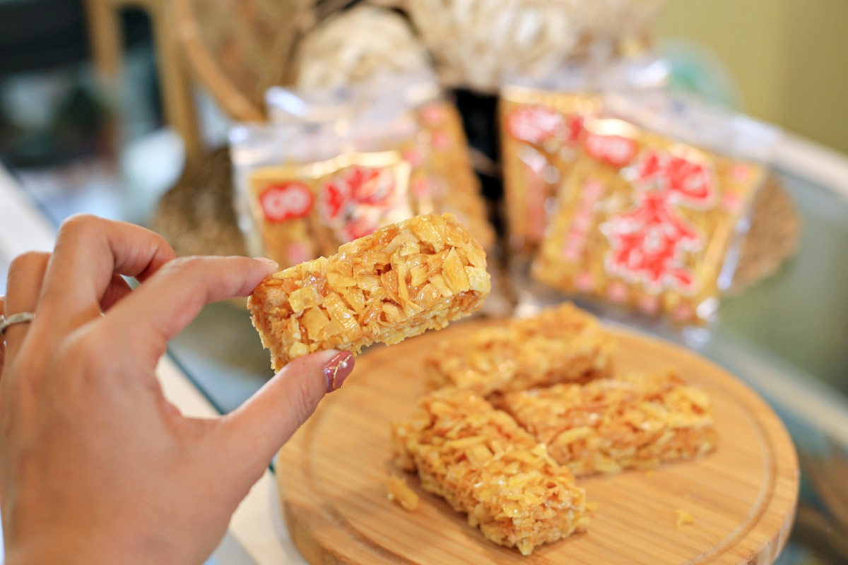 ▼「阿里山萬客香」位在阿里山公路起點的萬客香,伴手禮選項非常多元,其中最吸睛的就是現場新鮮製作的「牛軋餅」,鹹香酥脆的蘇打餅,搭配Q軟香甜的牛軋糖,吃一口就欲罷不能,嘴巴停不下來!另外還有其他小點心,像是多種口味的椰子球、手工餅乾等等,店內還有面費的咖啡可以喝,如果去阿里山玩,回程的時候一定要停下來逛一下!