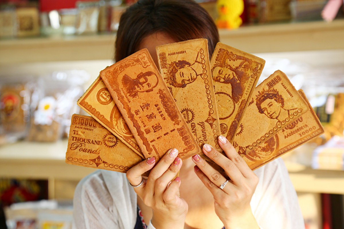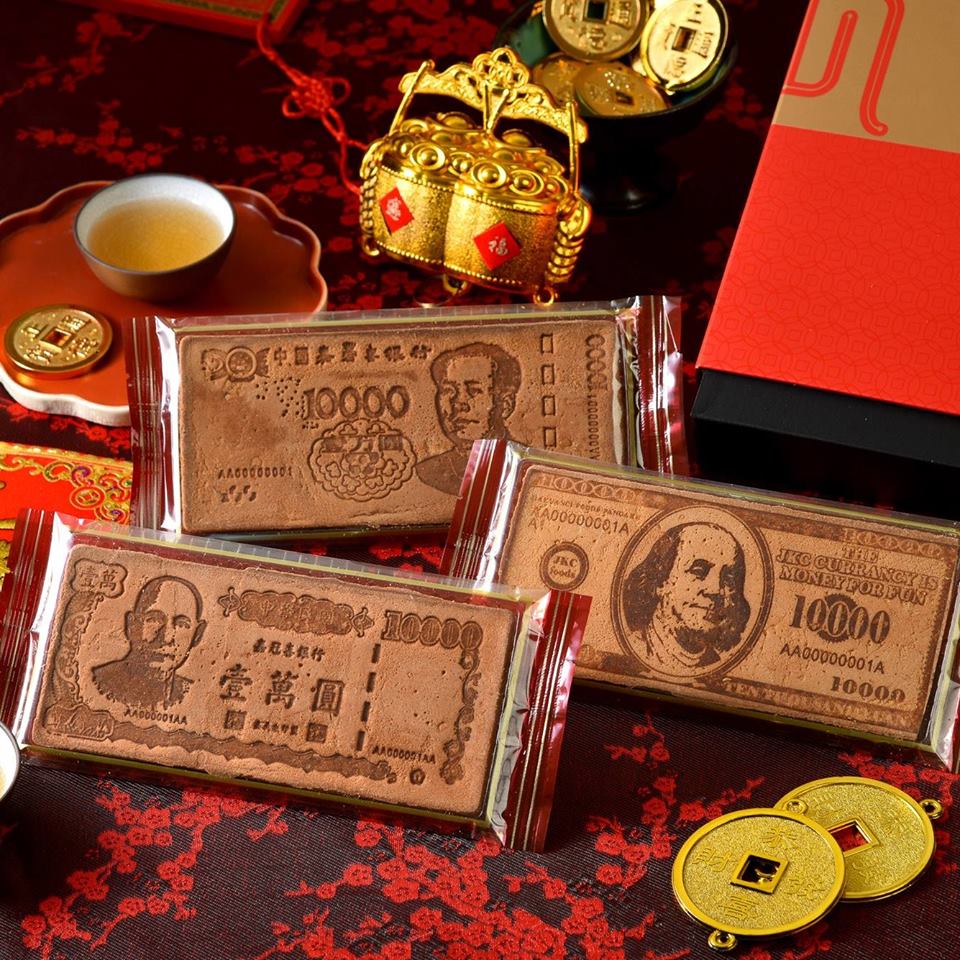 ▼「嘉冠喜煎餅」一打開禮盒,看到裡面有新台幣、美金、人民幣、英鎊,收到這發大財禮物一定會超開心啊!創意十足的煎餅禮盒,成為逢年過節超人氣的團購商品,老闆也自嘲說:「是全台第一間合法印製的假鈔工廠」!