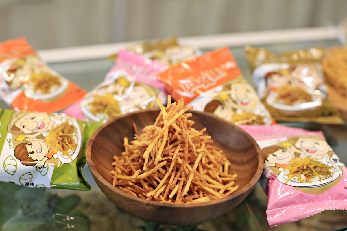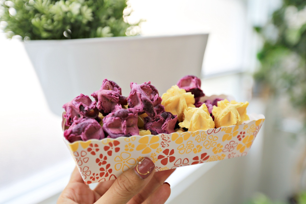 ▼「瓜瓜脆」是最新推出的超細地瓜薯條,有原味、甘梅、胡椒鹽和芥末椒鹽四種口味可以選擇,瓜瓜脆也被人稱為是「台灣地瓜版的薯條三兄弟」。另外還有造型可愛的「鬆餅球」,選用黃地瓜、紫地瓜作成的包餡小球,微甜地瓜內餡吃起來清爽不油膩,很適合送給女性朋友們吃!