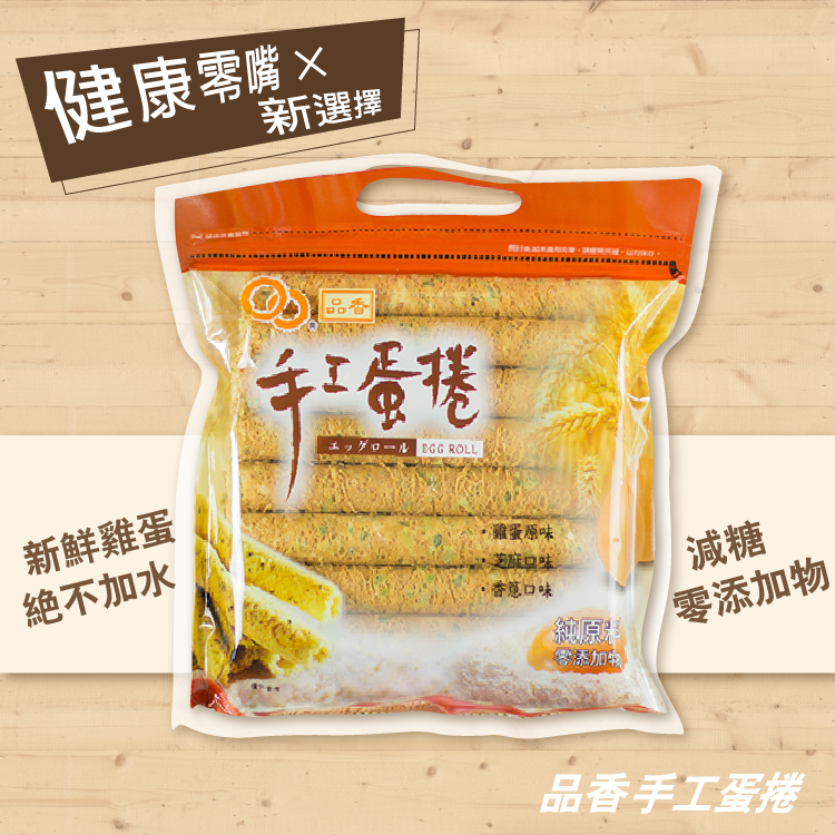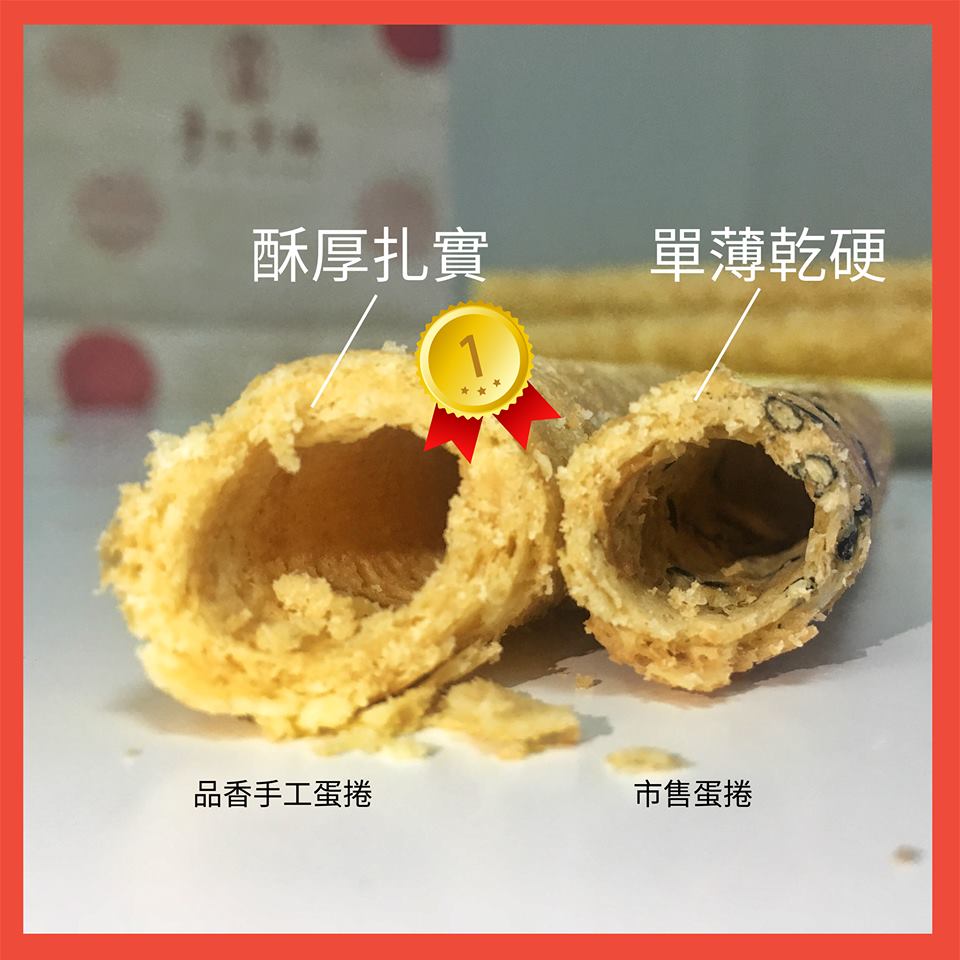 ▼「品香手工蛋捲」純手工製作,沒有任何添加物,不加一滴水,整隻蛋捲含蛋量高達30%!每吃一口都能感受到濃厚雞蛋香氣,酥脆又不膩口、真材實料的蛋捲,讓你一吃就愛上!