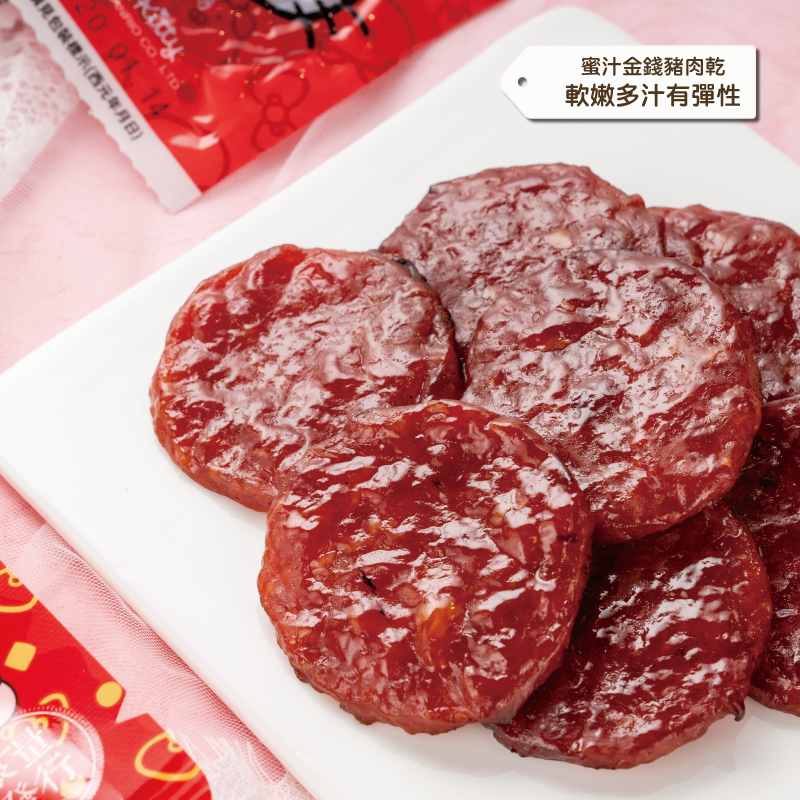 ▼這次推出兩款Hello Kitty有不同的口味,分別是口感紮實的方形「蜜汁厚片豬肉乾」,以及軟嫩多汁的圓型「蜜汁金錢豬肉乾」。