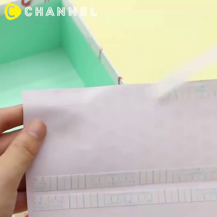 ▼在包裝紙背後貼雙面膠,把包裝紙貼在紙盒上;