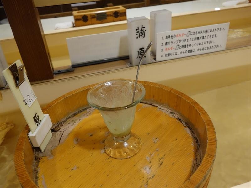 ▼一進入這間店,首先看到的就是偌大的迴轉流水席座位。水緩緩流動,上面還有一些木盆。木盆載著料理緩緩漂到客人面前。
