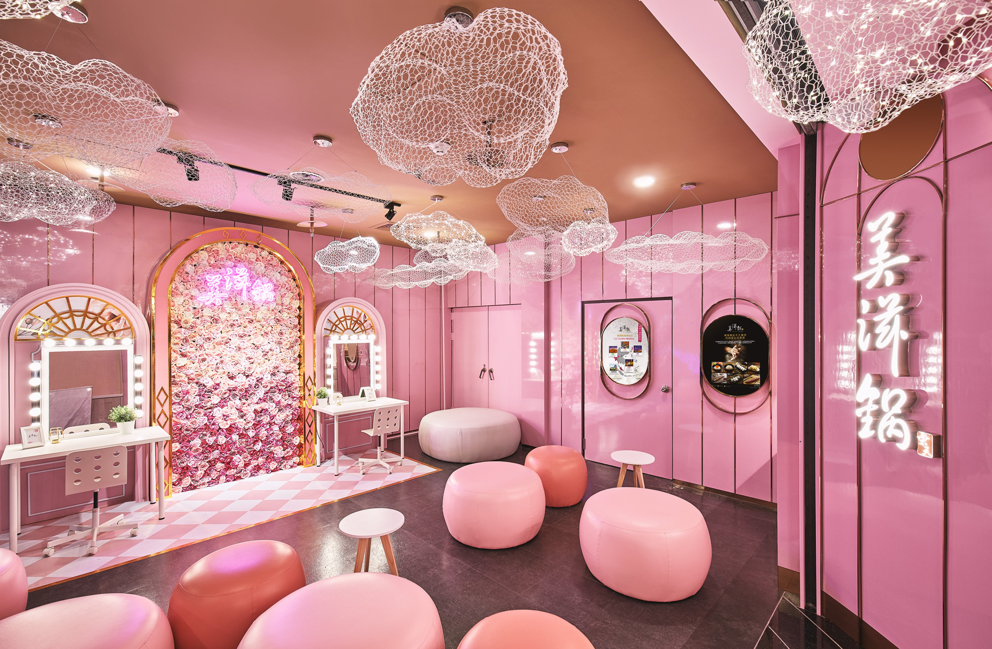 ▼愛美、愛拍照的你一定要來這裡!專為女人創造出270坪粉紅夢幻的空間,一進門就能看到上百多玫瑰組成的美滋鍋招牌標誌「巨型粉紅熊」,並點綴著夢幻星光與雲朵,讓你一踏進火鍋店,彷彿走進時尚奢華的粉色童話世界!