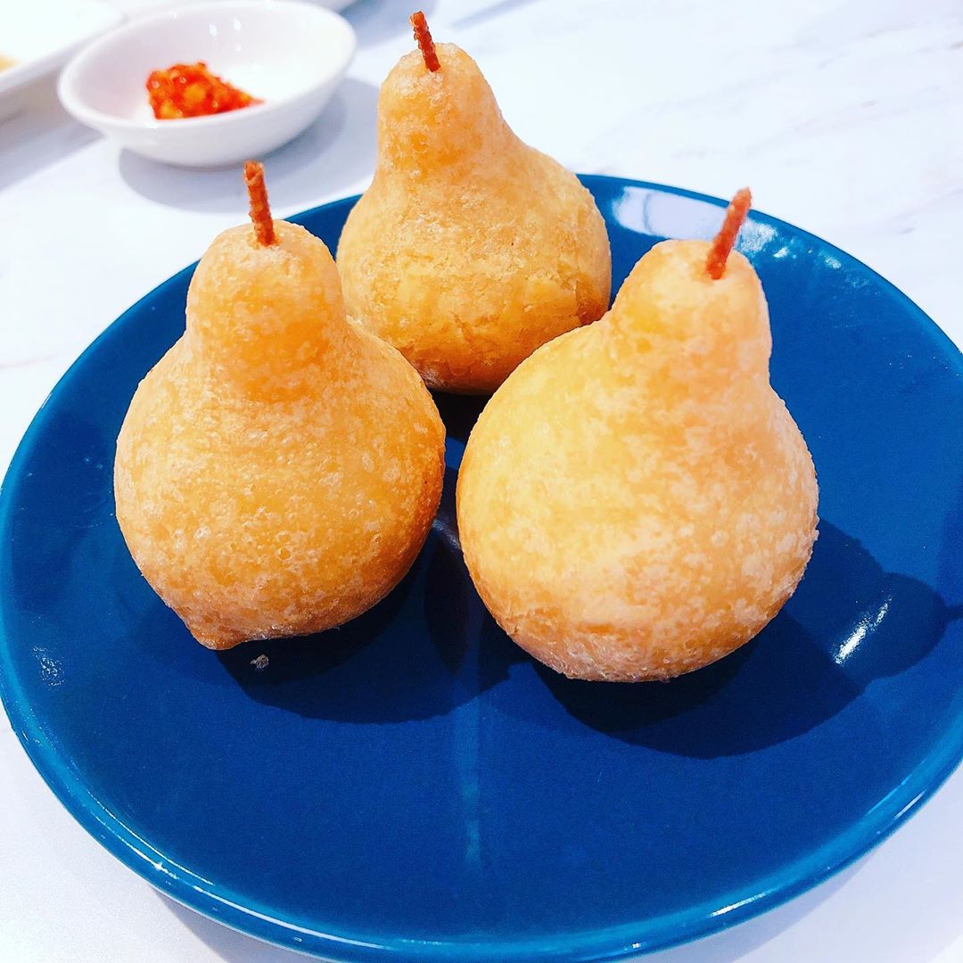 ▼QQ的金梨鹹水角(105元),可愛的外表就像一顆顆梨子一樣,而內部則包著類似瓜子肉的內餡,外皮彈牙的口感搭配鹹香多汁的內餡,多層次的滋味讓人一顆接一顆。