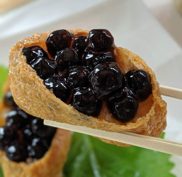 ▼珍珠稻荷壽司讓人眼前一亮,把日本壽司中定番的稻荷壽司加入珍珠塞滿,看起來很有創意。吃過的人也表示,甜甜的珍珠與稻荷壽司的豆皮搭配很巧妙,珍珠的口感跟白飯非常搭,很值得品嚐。