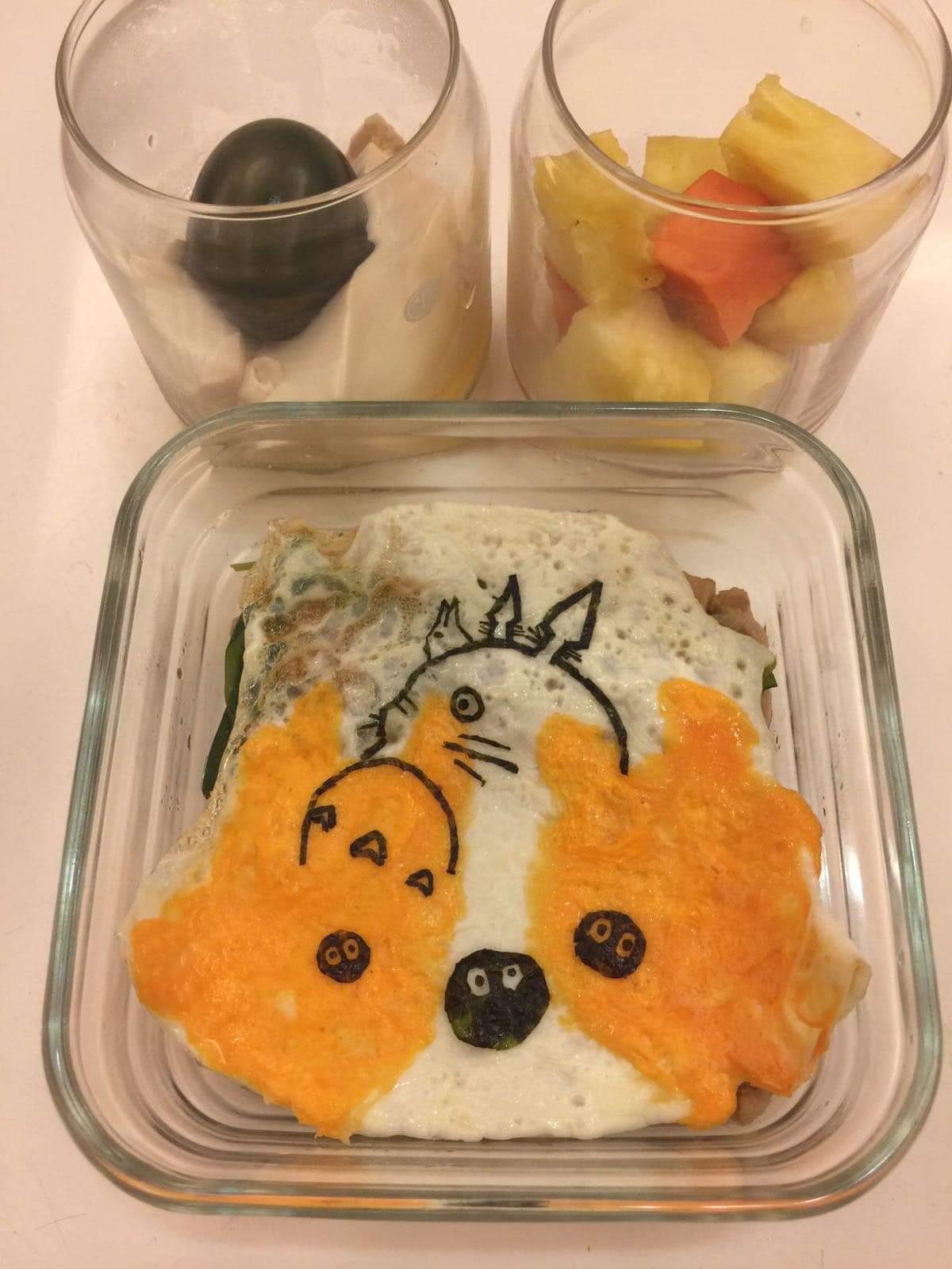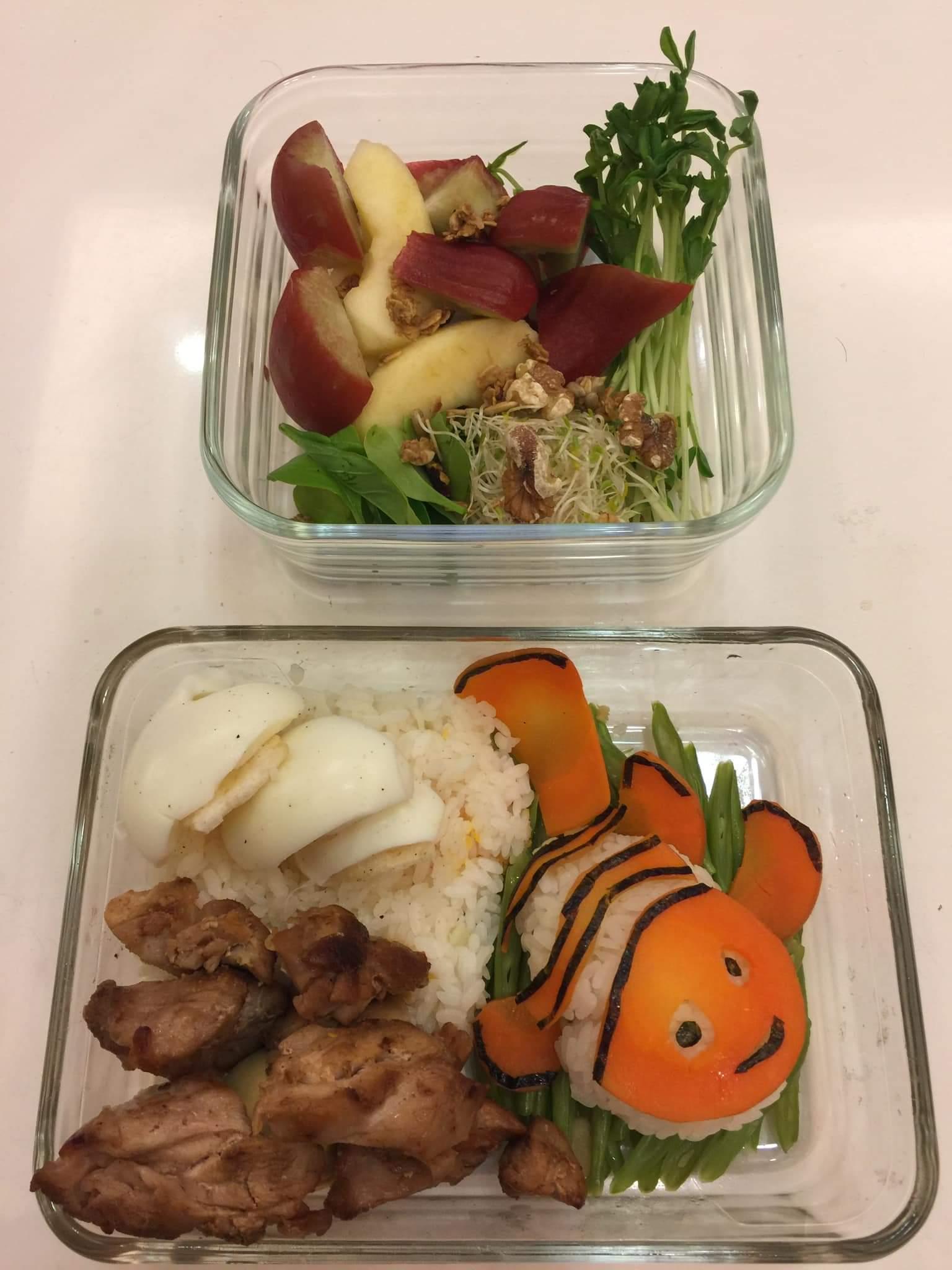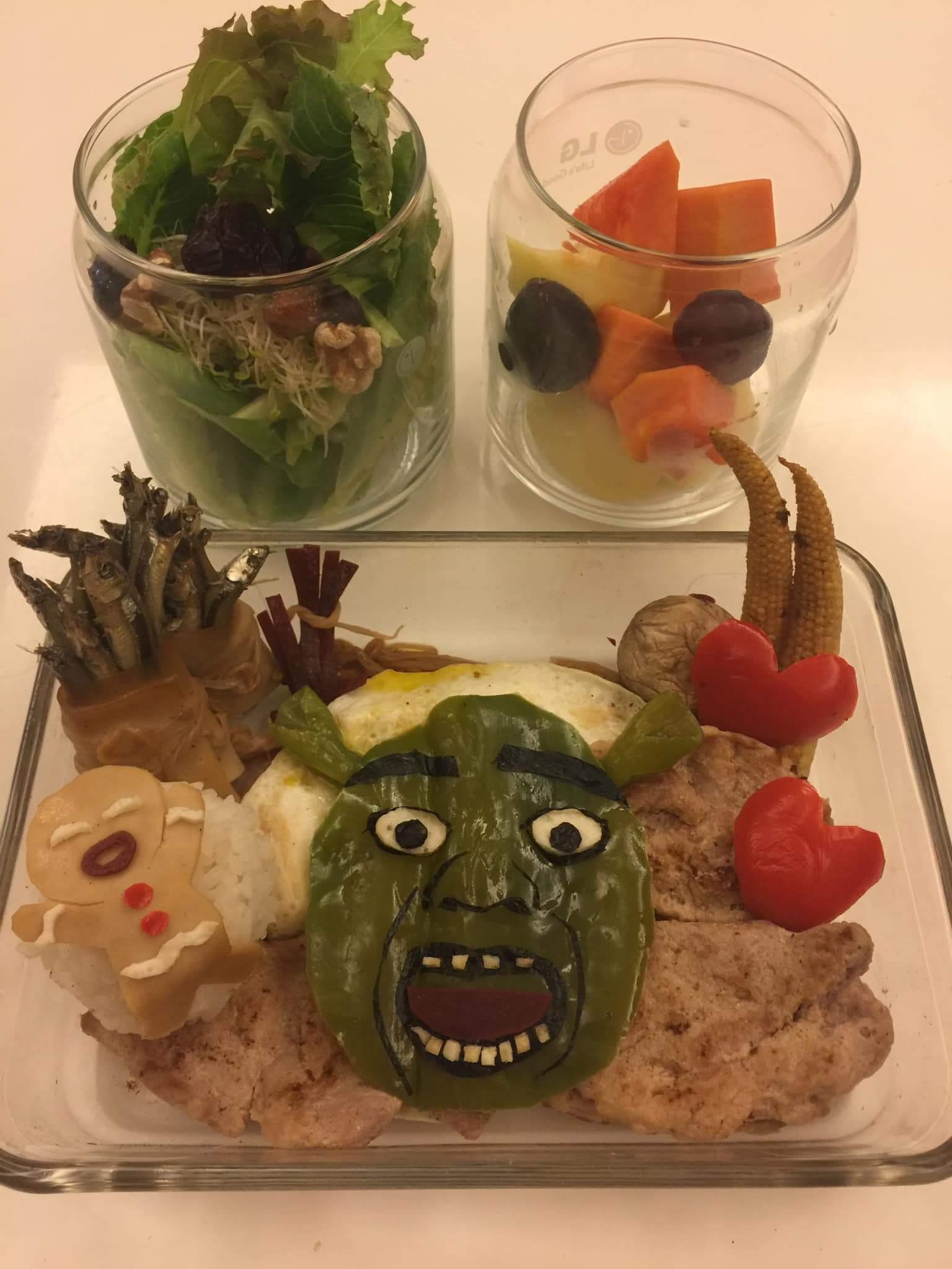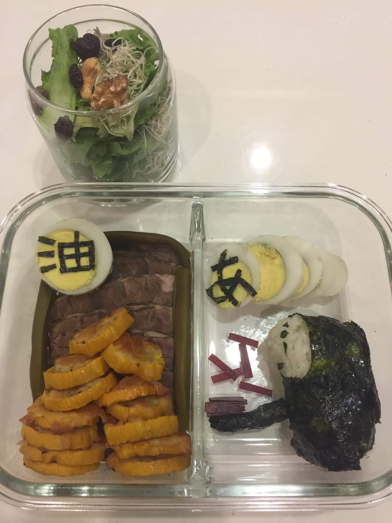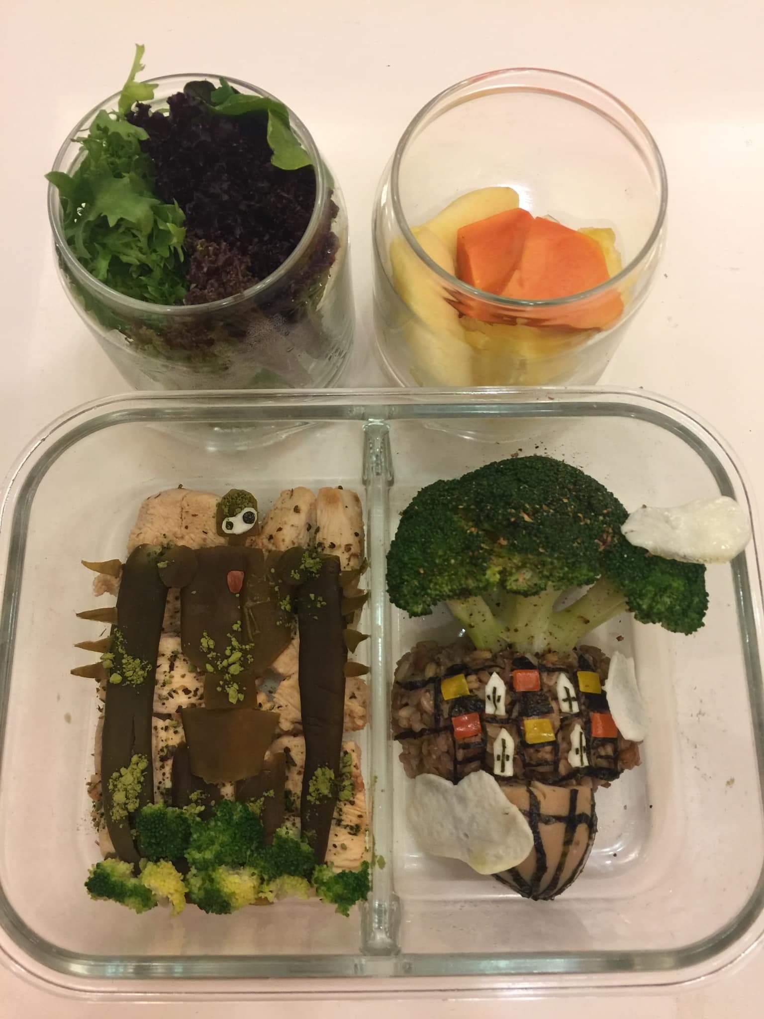 ▼從照片可以看到,老婆為了幫他兼顧營養均衡,便當裡一定會有沙拉、蔬果,以及肉類補充蛋白質,更不用說上面精緻的裝飾了!