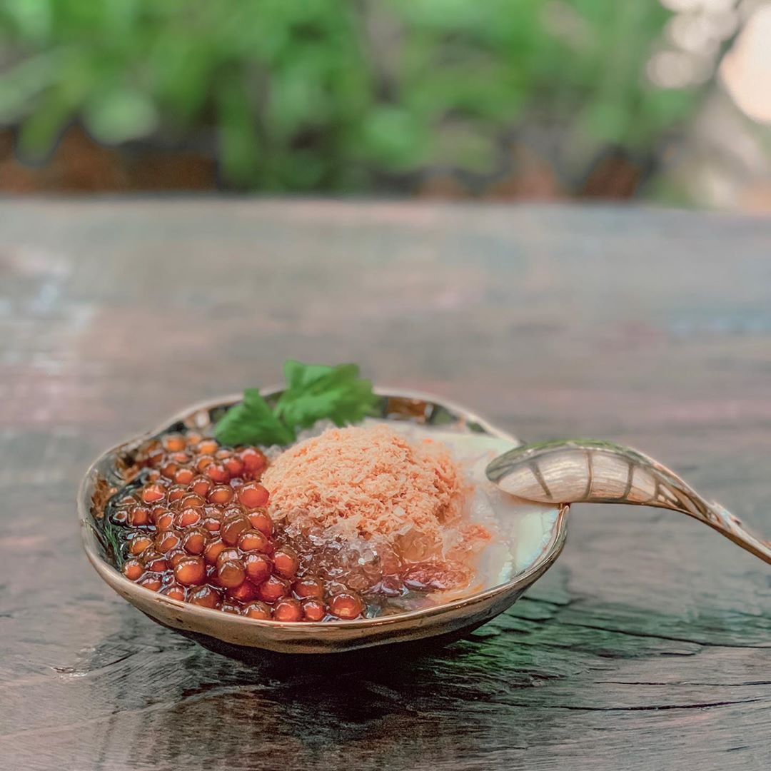 ▼此外,還能選擇加料粉圓或桃膠,金邊的黑碗盛裝著琥珀色的粉圓、桃膠,與黑糖水一同襯托出豆花的潔白無瑕,最後再放上一片香菜點綴,拍起來超級美。