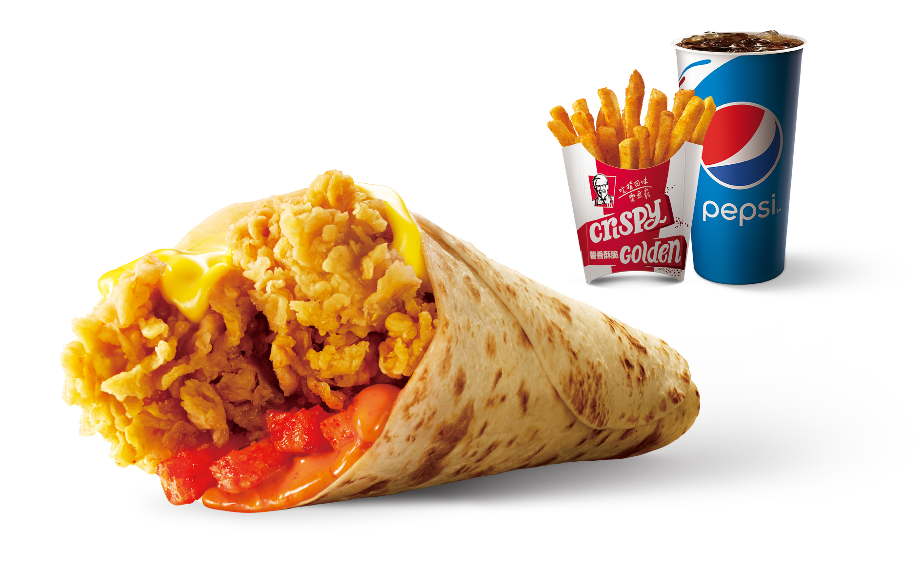 ▼泡菜起司脆雞捲:酥脆又多汁的經典脆雞腿條與香濃起司,搭配解膩清盈的韓式醃蘿蔔泡菜,淋上微辣開胃韓式泡菜醬,包在獨家美味烙烤餅皮中,每一口都能感受到雞腿的鮮、起司的濃、蘿蔔泡菜的清爽與餅皮的香氣,交疊出最高級的美味。