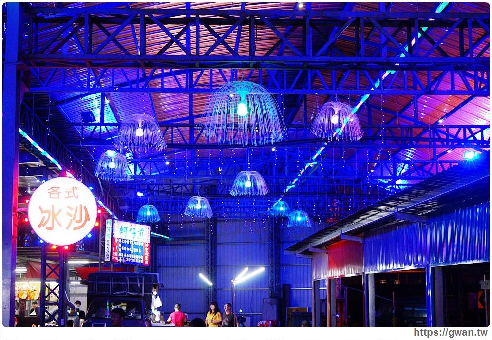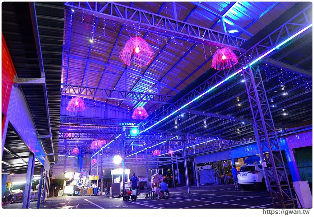 ▼「台中瑞豐國際美食村」佔地400坪,非常貼心地設有屋頂,逛夜市不用怕下雨。太陽一下山,天花板就點起「水母燈」,一整片霓虹風色彩、顏色還會變換,非常吸引目光,拍起來也挺美的。