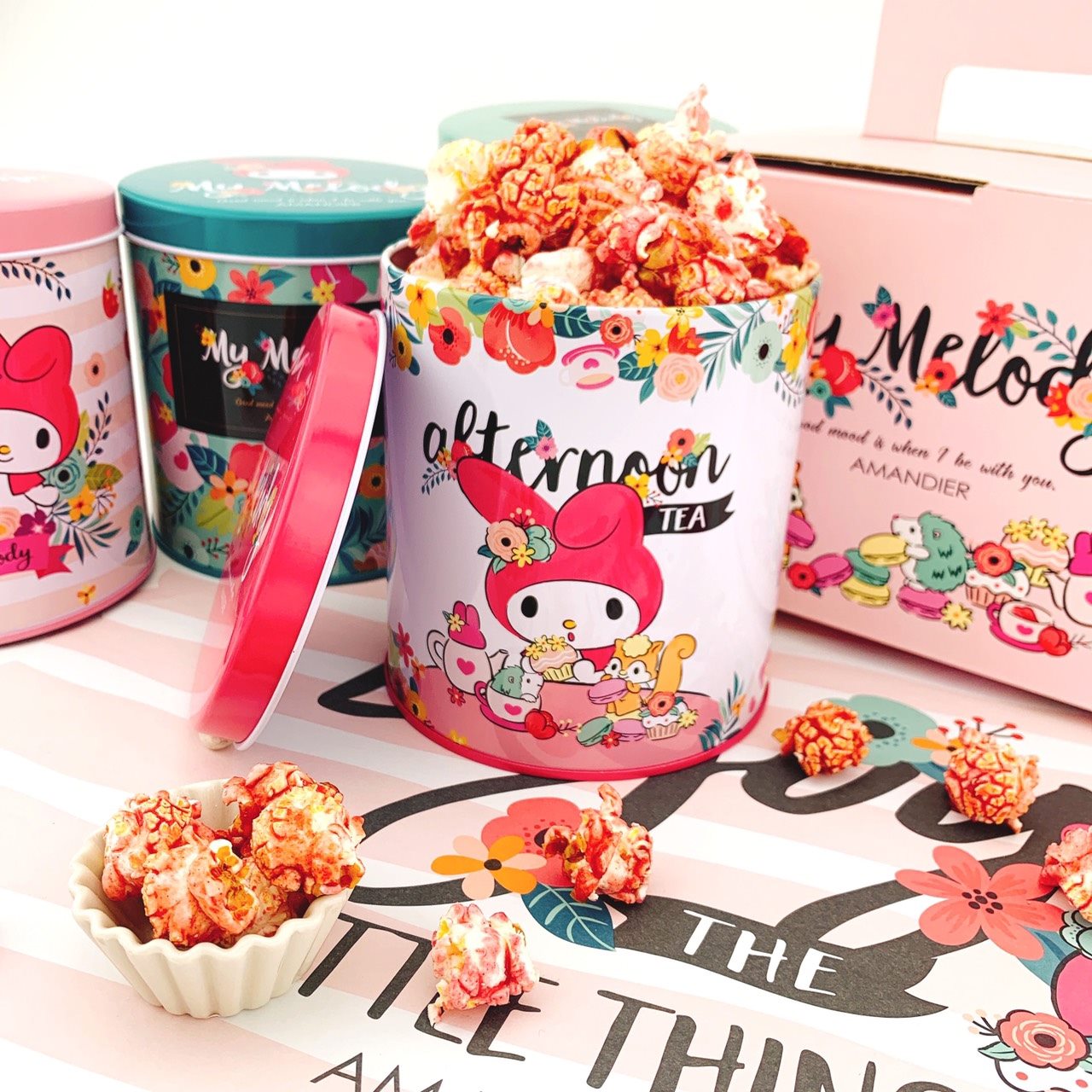 ▼美樂蒂米花鐵罐,也是鐵粉必收套組,搭配美樂蒂獨家限定「乾燥風花草粉色手提盒」,以夏末初秋最粉嫩的乾燥色系為基底色調,把瓶瓶罐罐妝點得超可愛!米花總共有清粉草莓、粉綠焦糖、艷桃莓果、粉草檸檬玫瑰四種口味,超療癒的花草風好像走進美樂蒂的夢幻世界~