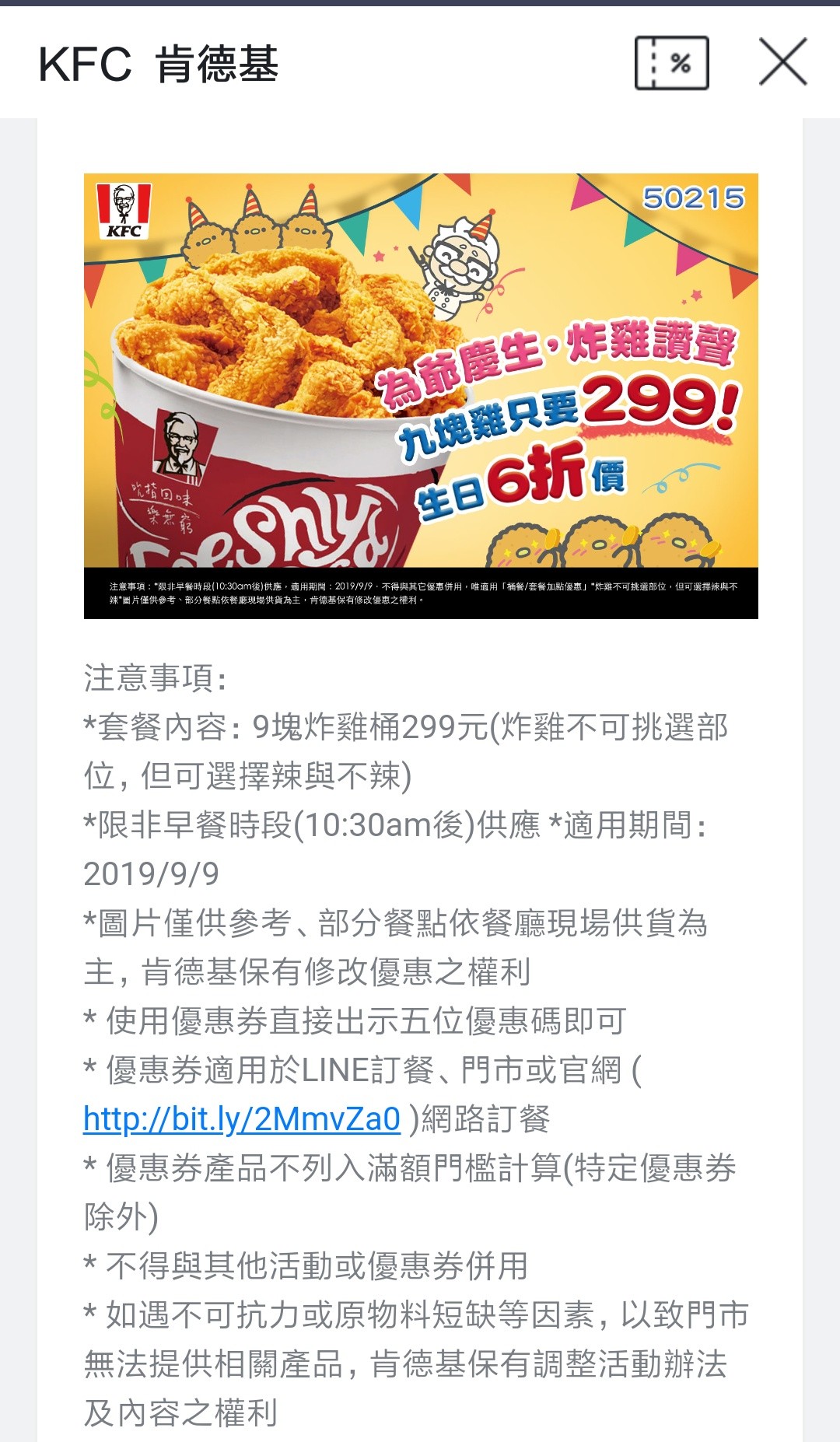 ▼肯德基在官方LINE上宣布這次活動「為爺慶生,炸雞讚生」。人氣超高的9塊雞桶餐在9月9日這天只要299元,平均一塊才33.2元。供應時間從早上10:30至當天營業結束,優惠碼為「50215」.