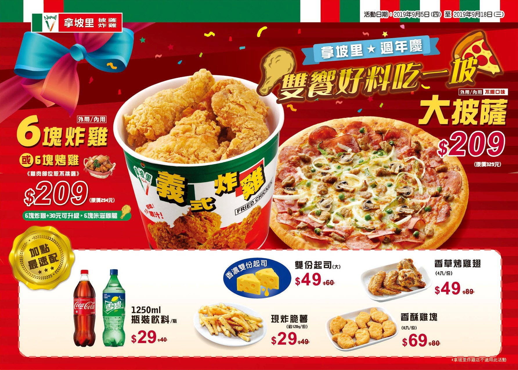 ▼除了肯德基,速食店拿坡里也在舉辦週年慶活動。9月5日到18日期間,口味任選大披薩只要209元、6塊雞同樣是209元、6塊咔滋雞腿只要239元,可以整桶換烤雞,不過不可以選擇雞肉部位。內用或外帶都可以享有優惠。