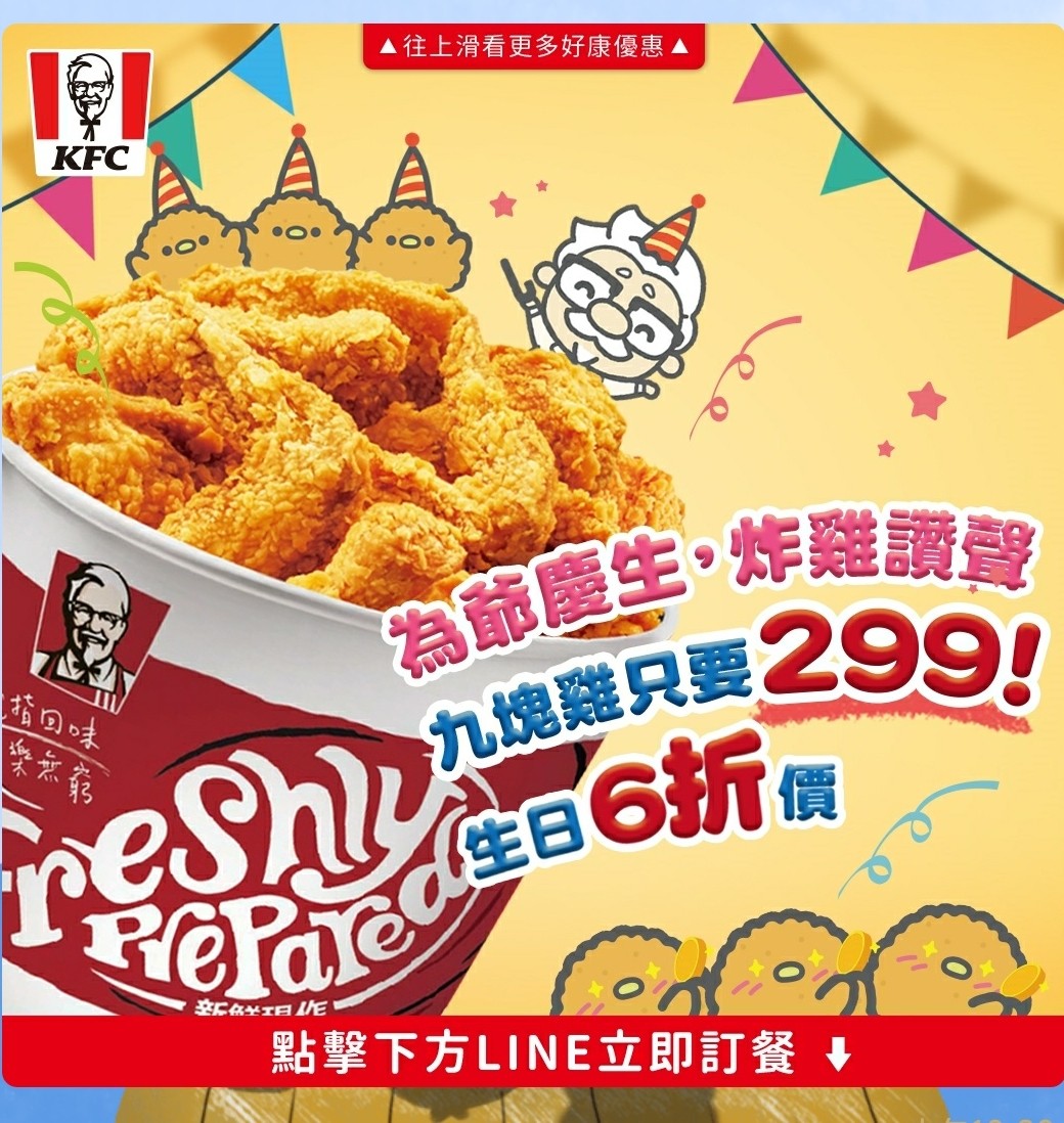 肯德基爺爺生日送「生日6折價」 用優惠碼「9塊炸雞桶只要299元」