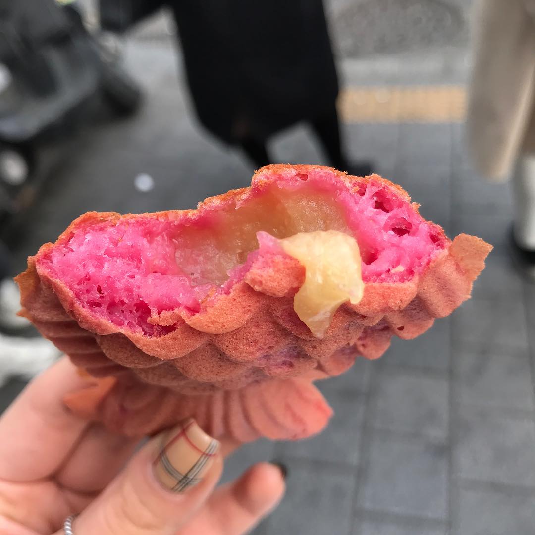 ▼粉紅鯽魚餅是由紫薯製成,在烤的酥香的外皮內,仍然有著綿密的紫薯泥,再加上上甜而不膩的蕃薯餡,真的是秋冬必嚐美味!
