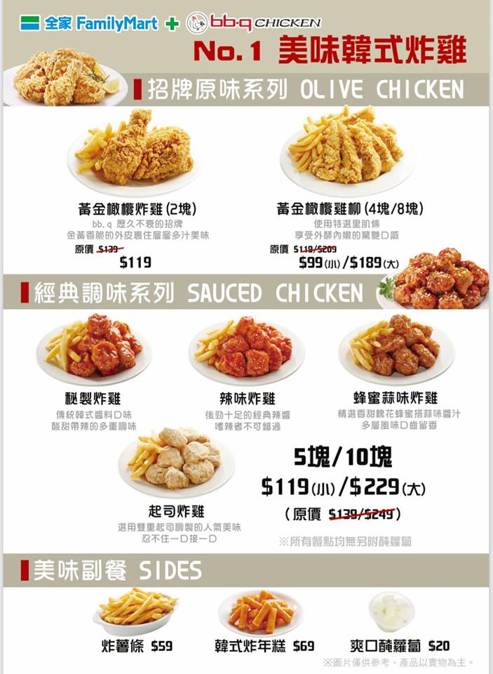 ▼目前全家bb.q CHICKEN店中店的菜單是以兩款招牌原味、四款經典調味為主,也有非常受歡迎的附餐「韓式年糕」等等韓式料理,期待未來旗艦店會以怎麼樣的料理形式呈現。
