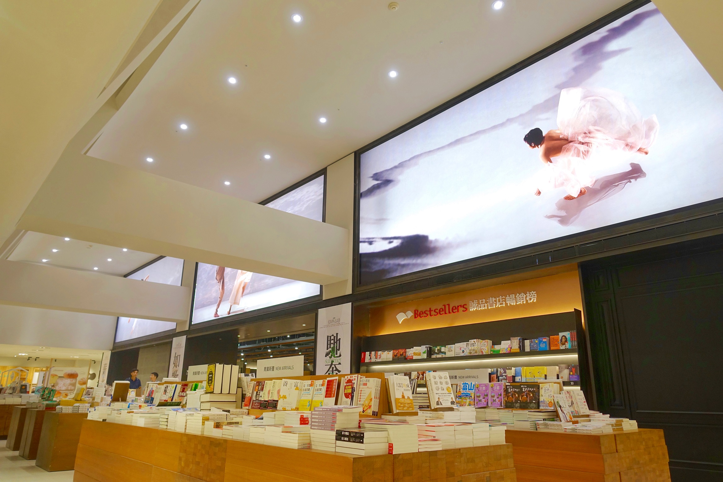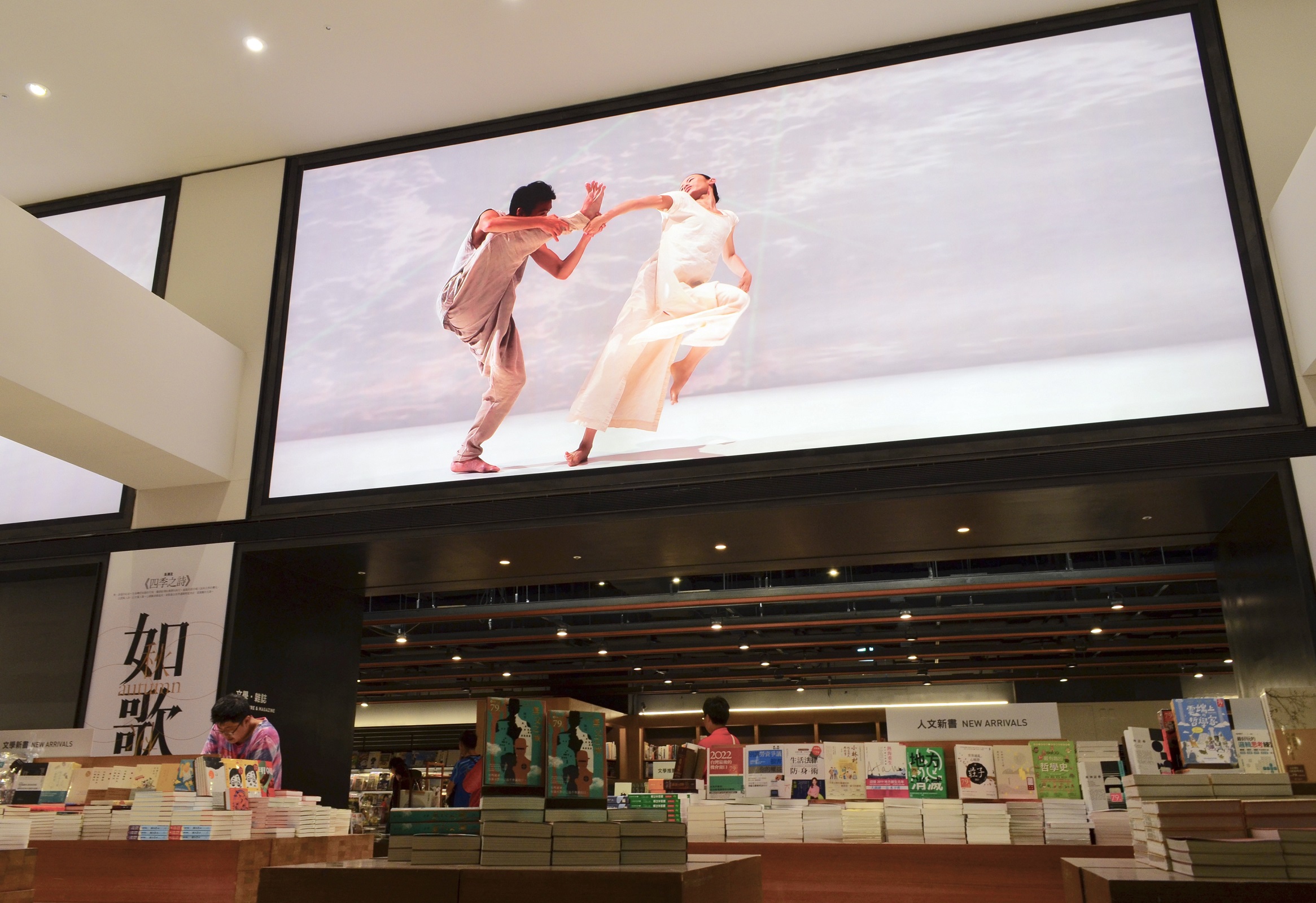 ▼3面全長逾21公尺的大型「藝術光牆」,更首度與雲門舞集合作,以舞蹈呈現書法美學的「屋漏痕」、流水意象的「白水」,透過雲門舞者空靈清麗的舞蹈姿態,將動靜間的力與美帶入書店閱讀空間。