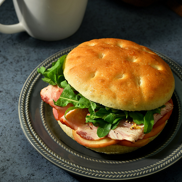 ▼義式雞肉佛卡夏:以點綴橄欖、油漬番茄乾等義式素材的方形佛卡夏為基底,夾入特調義式香料雞胸肉片、地中海朝鮮薊、在地水耕萵苣、充滿甜香的烘烤彩椒與奶油乳酪抹醬,鹹香平衡,主廚精彩創作的義式街頭創意料理。