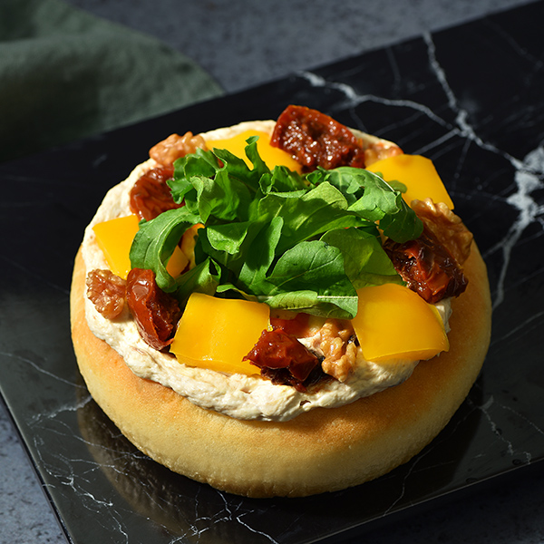 ▼鮪魚乳酪番茄佛卡夏:以義大利原裝進口專用粉製作的圓形佛卡夏,內餡搭配義大利油漬風乾番茄、核桃粒,調和奶油乳酪的地中海經典鮪魚醬,再以略嗆口的芝麻葉提味,佐以經過烘烤的甜美黃椒增添溫暖氣息與層次。