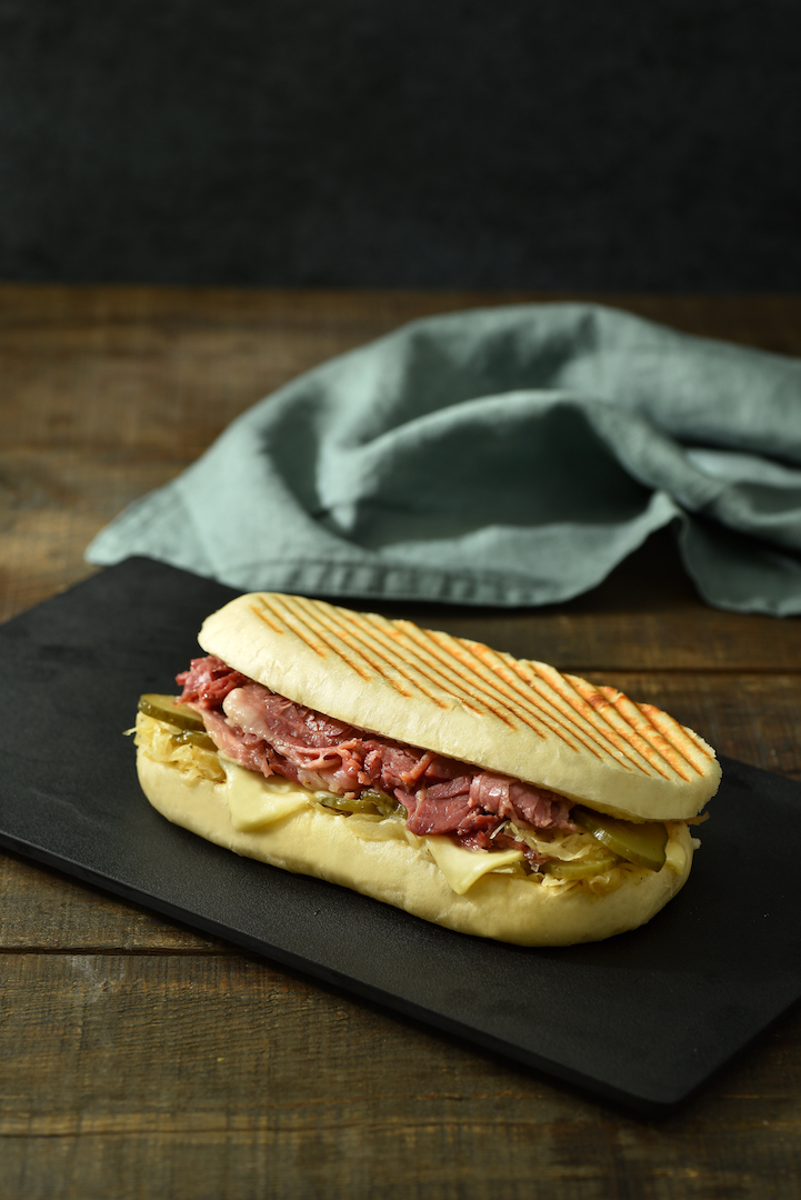 ▼美式牛胸薄片帕里尼:以香料醃製的燉煮牛肉切薄片後夾成帕里尼,獨樹一格的艾曼達起司與油漬蔬菜(酸黃瓜及酸菜)的結合、綴以風味鮮明的英式芥末醬汁畫龍點睛。