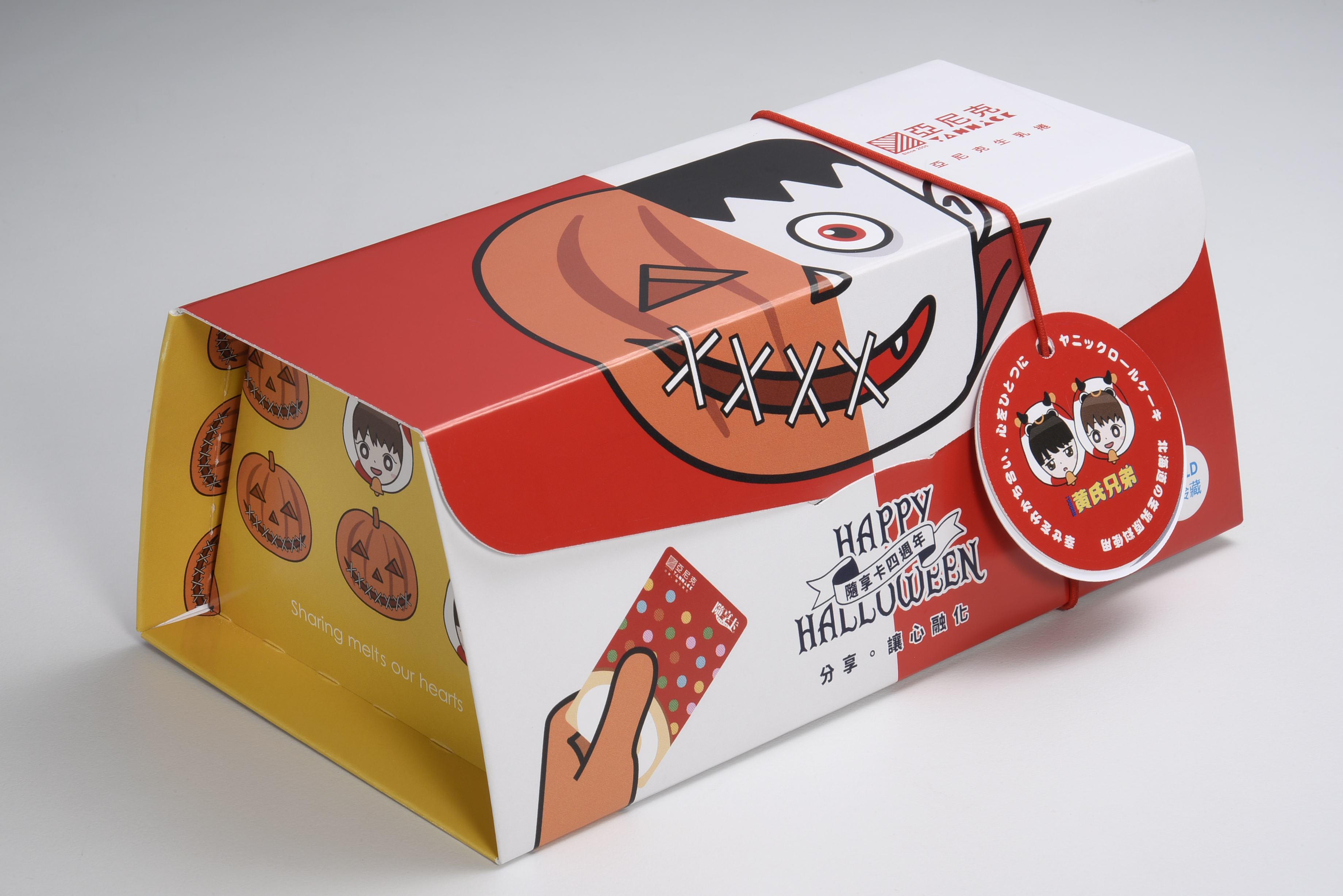 ▼這次亞尼克與黃氏兄弟合作「黑糖珍珠撞奶生乳捲」,就連外包裝也印上Q版黃氏兄弟,為了呼應萬聖節的氣氛,在外包裝上也印上了南瓜等圖樣!