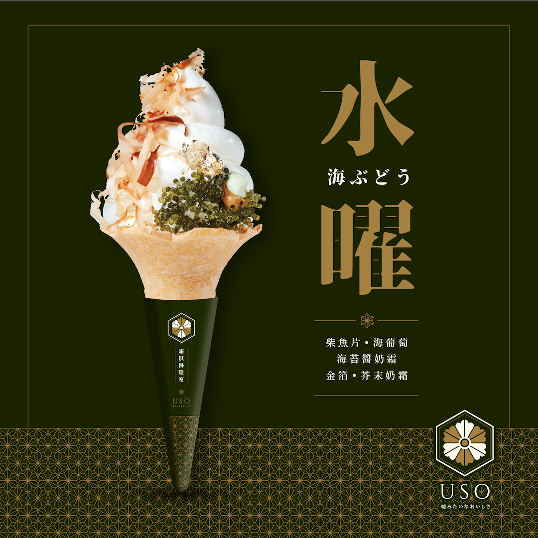 ▼另一個「水曜」海葡萄口味,感覺比較合理一點,但是鮮奶霜淇淋配上天然海藻的海味還是讓人很好奇到底是什麼味道啊!此外,這款還加上了柴魚片提箱,還以為是在吃日式手卷呢~