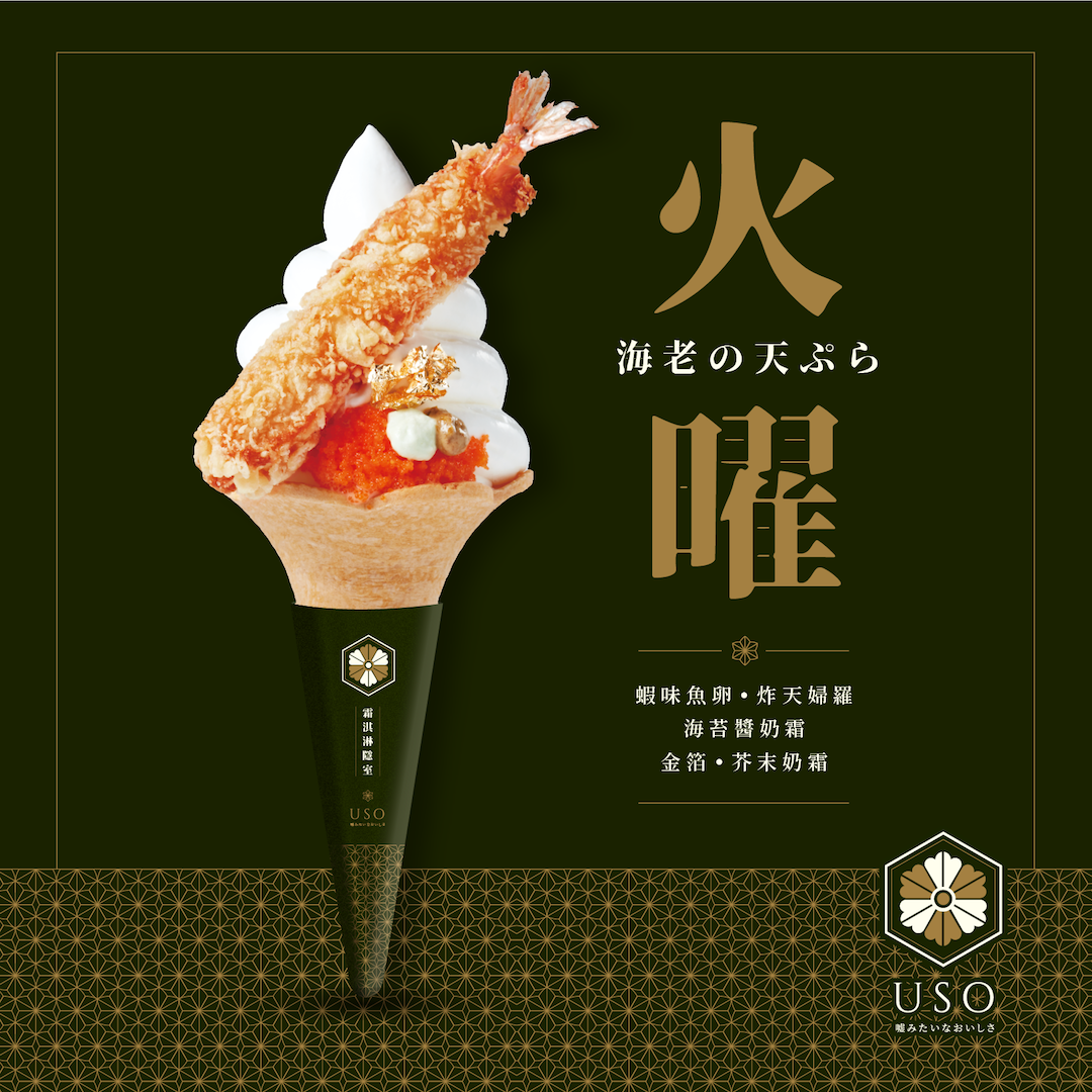 ▼另一款鹹品「火曜」也狂到不行,一樣以鮮乳霜淇淋為基底,擺上天婦羅、蝦卵、芥末奶霜、海苔醬奶霜、海苔絲等,這吃了不會拉肚子嗎XD?