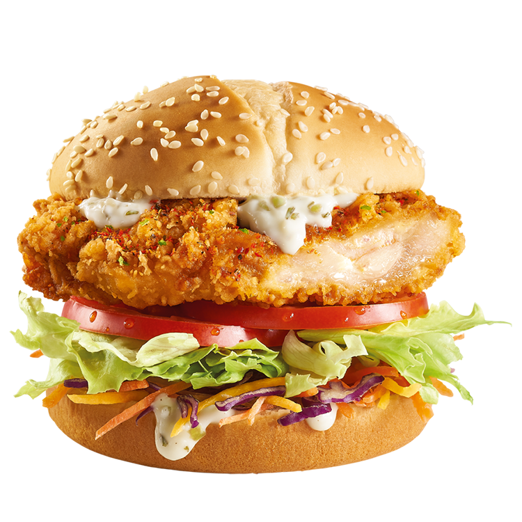 ▼微辣的日式柚香胡椒粉,為酥脆的無骨鷄腿排增添柚香與多層次風味;最後鋪上新鮮蕃茄及生菜,鹹香的脆鷄與輕檸塔塔醬完美融合、互相襯托,品嚐職人等級的爽口日式柚香風味!