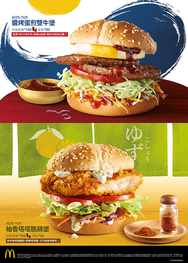 2019年09月24日台灣麥當勞看準國人出國嚐鮮美食的熱潮,9月25日起至11月5日止,率先推出韓式秘製醬燒風味的「醬烤蛋煎雙牛堡」,並首度使用濃厚甘甜的韓式水梨BBQ醬入堡,讓饕客齒頰留香;10月9日起至11月5日止,接力推出日式爽口柚香風味的「柚香塔塔脆鷄堡」,兩款漢堡均與道地巷弄美味結合,每咬一口都彷彿置身在異國街頭,不用出國也能享受舌尖上的輕旅行,讓生活來點不一樣!