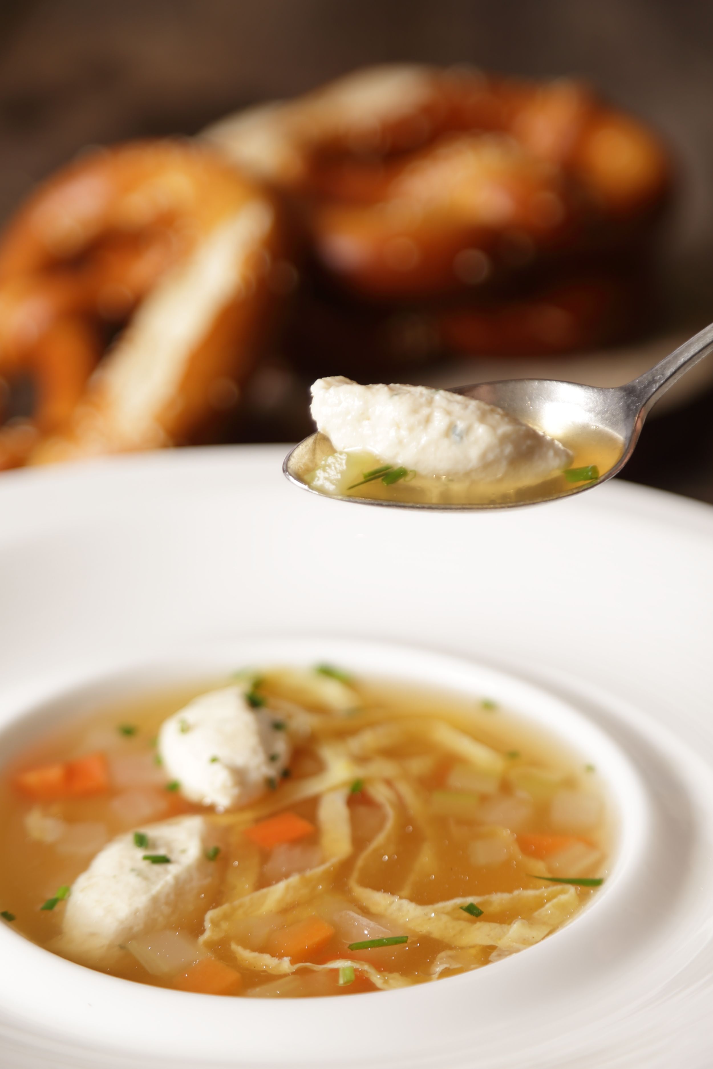 ▼一樓栢麗廳的餐檯上則有超過20款麥可主廚設計的佳餚,其中最具特色的是德國啤酒節的經典招牌菜:皇家婚禮湯,皇家婚禮湯的湯底是晶或24小時熬煮而成的清雞湯,其中還有加入紅蘿蔔、洋蔥、杜仲葉等食材增添甘甜,湯裡的食料則有雞肉丸、煎蛋切片以及蛋餅絲。