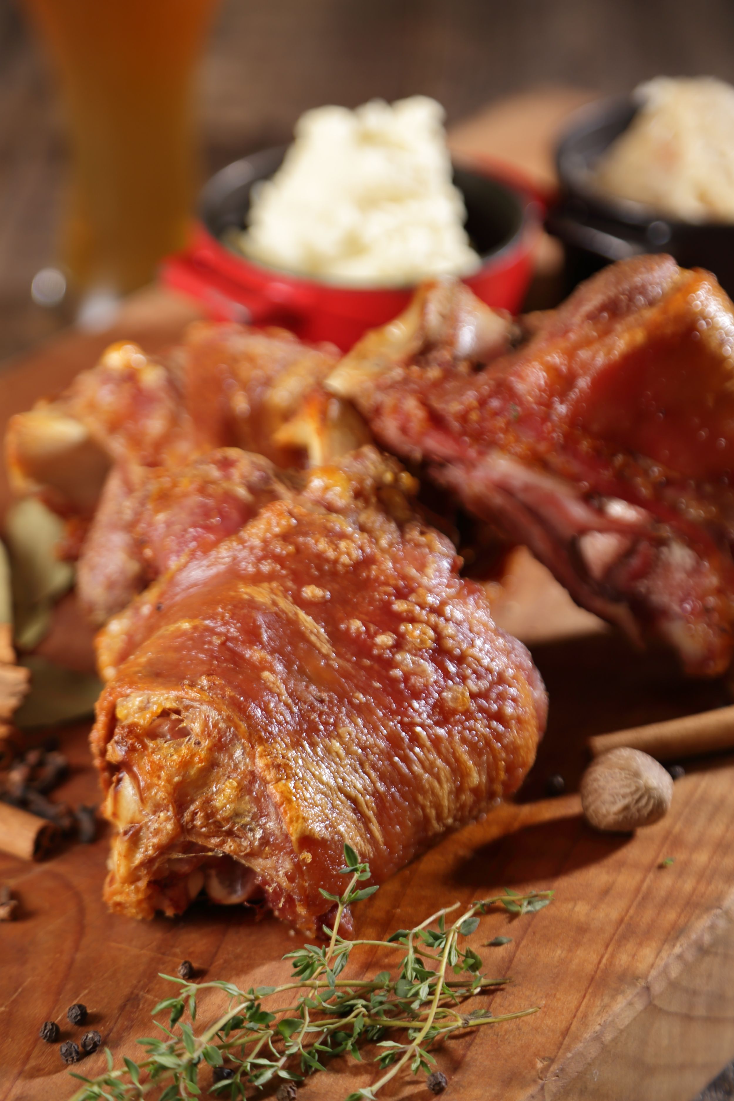 ▼經典傳統美食還包括「德式烤豬腳」,則以台灣本地黑豬豬腳部位,先經滾水煮熟後撈起,去除多餘雜質,再與月桂葉、杜松、胡椒、洋蔥等調料一同以大火熬煮兩個小時,再放入烤箱慢烤約一個半小時慢慢逼出油脂,當表皮漸漸成金黃色即成,食用時搭配以酸菜加入洋蔥、黑胡椒、月桂葉炒香而成的自製酸菜,造就油香且不膩口的地道滋味。