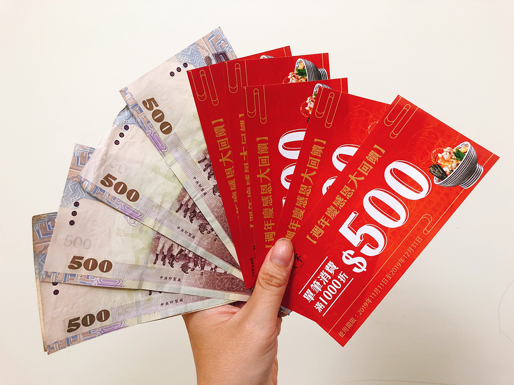 ◎活動方案:單筆消費滿1000送500(滿2000送1000以此累計。)
