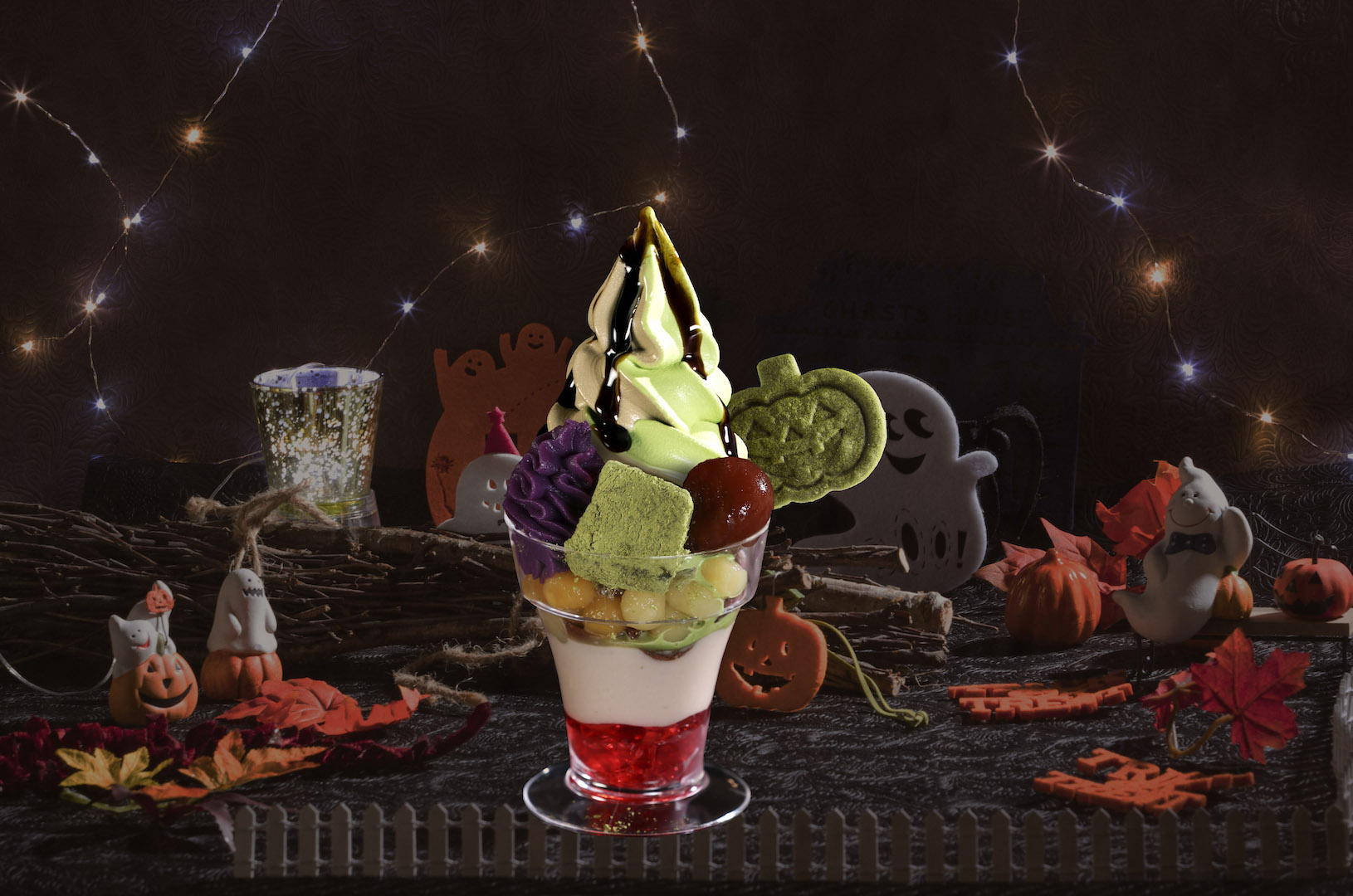 ▼萬聖節聖代:萬聖節造型餅乾(南瓜/蝙蝠/幽靈隨機一款)讓聖代洋溢著萬聖節氣氛。底層是酸甜蔓越莓果凍、鋪上濃郁香綿的芋泥、地瓜圓、糖漬栗子、抹茶蕨餅、紫地瓜泥等食材,擠入霜淇淋(抹茶/焙茶/綜合),最後淋上黑糖蜜,甜美的滋味與豐富的口感讓人欲罷不能。