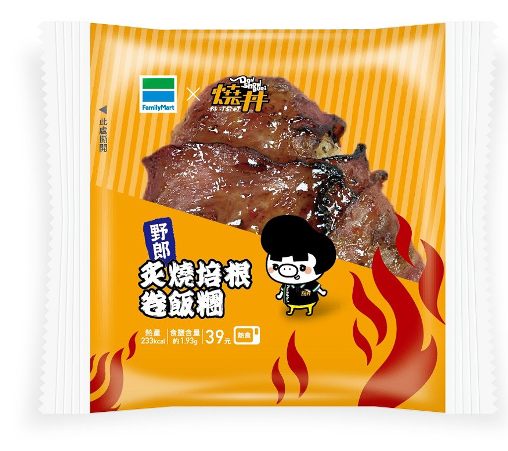 ▼「炙燒培根卷飯糰」售價39元,嚴選培根,包覆日式醬油飯慢火烘烤,再經炙燒,最後刷上糖燻野狼醬。