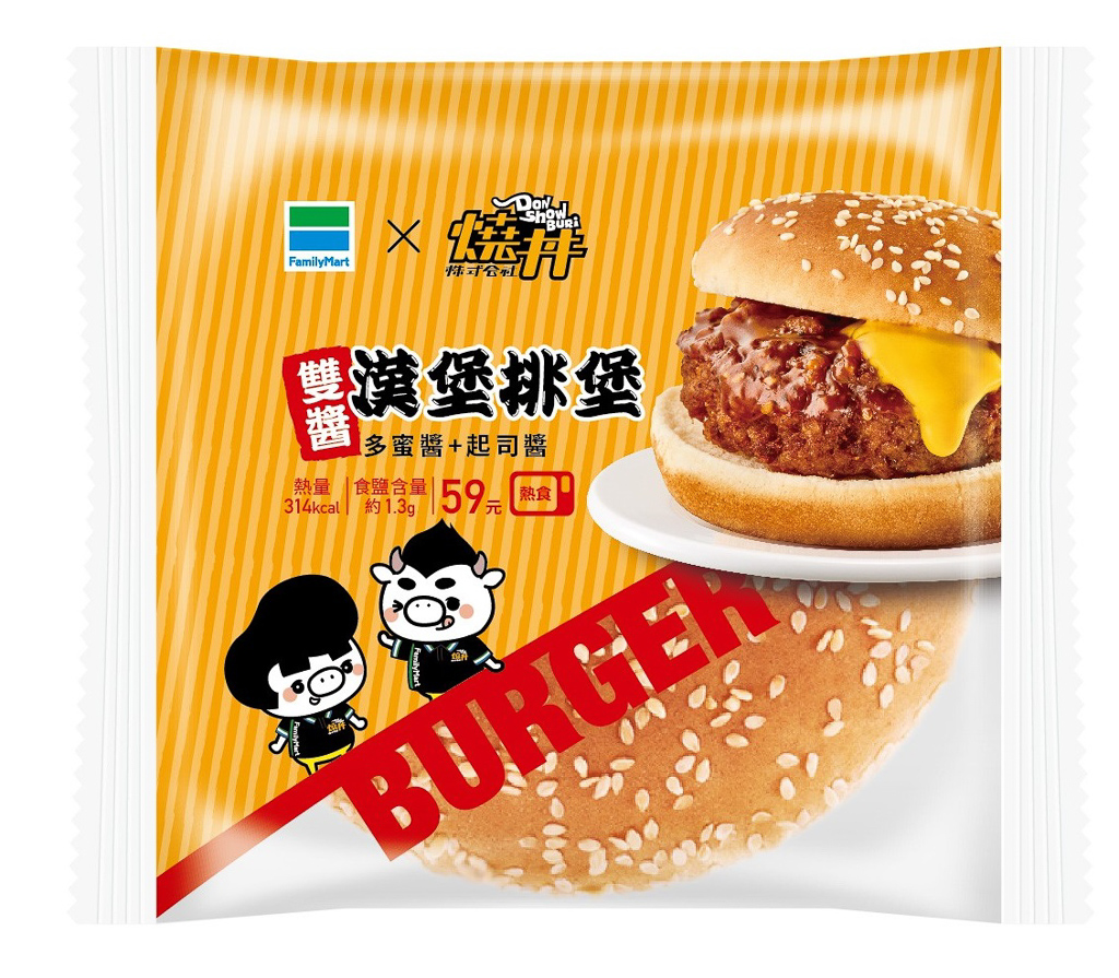 ▼「雙醬漢堡排堡」售價59元,手做1.5公分漢堡排,搭配燒丼季節限定多蜜醬與特調黃金起司醬,大口咬下肉感十足。