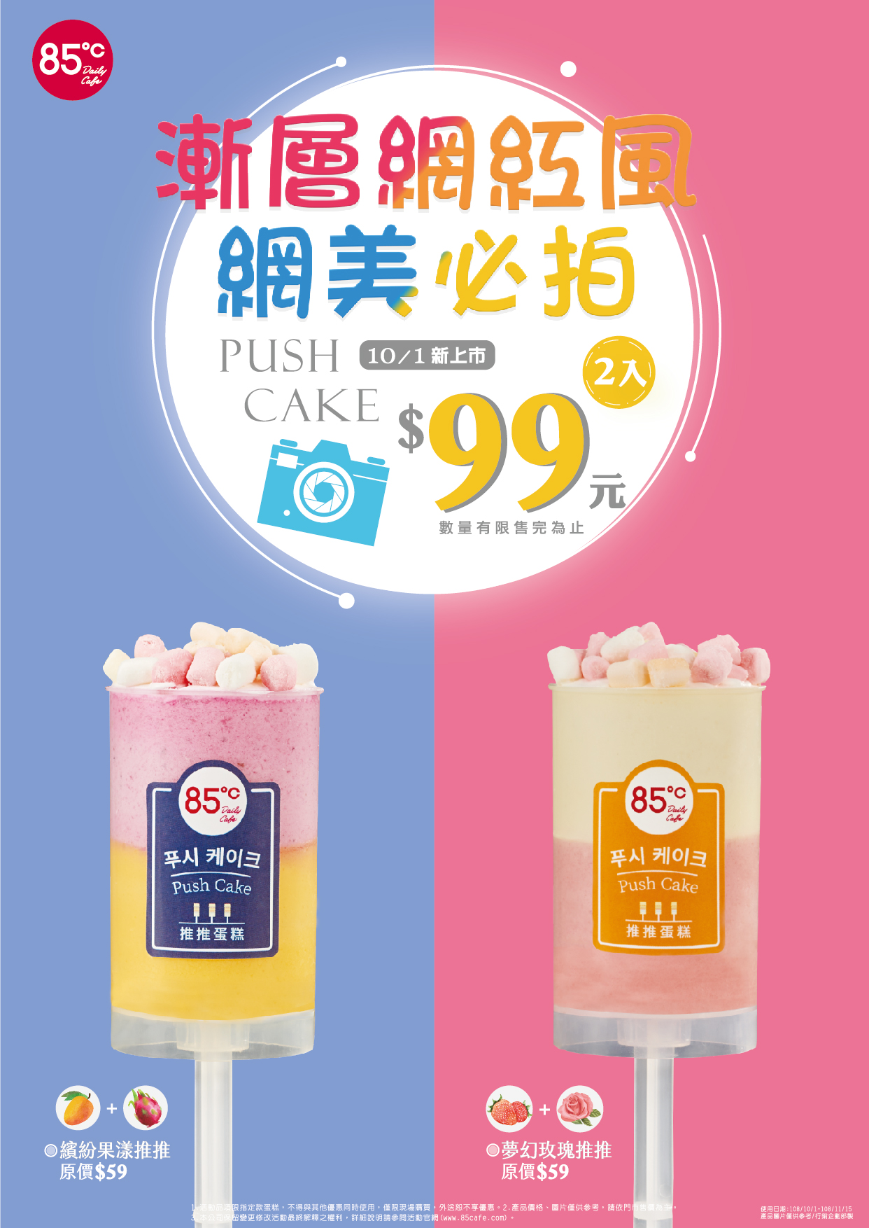 2019年10月08日85ºC去年推出在韓國超夯的「PUSH CAKE」推推蛋糕,引起搶購熱潮後!即日起,兩款「繽紛果漾推推」、「夢幻玫瑰推推」新品上市,優惠任選兩入99元,色彩繽紛的推推蛋糕再搭上鬆軟綿花糖,保證您愛不釋口。