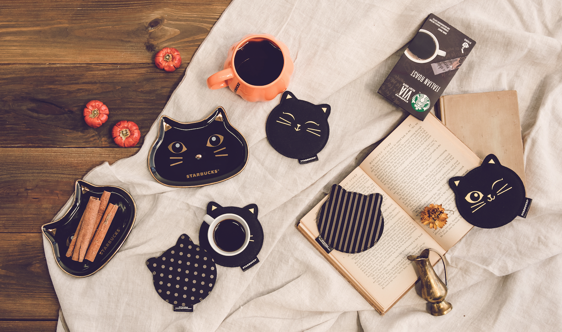 ▼星巴克推出超萌的萬聖節商品,除了先前介紹過的黑貓系列咖啡用品外,還有線上門市限定的黑貓造型盤、杯墊組。