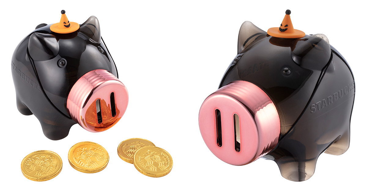 ▼今年春節熱賣的金幣巧克力小豬撲滿,萬聖節再推出新設計,以時尚黑色桶身搭配呆萌粉紅豬鼻子,還戴著一個可拆卸的萬聖節搞怪小帽,這麼Q的外型怎麼能不收~